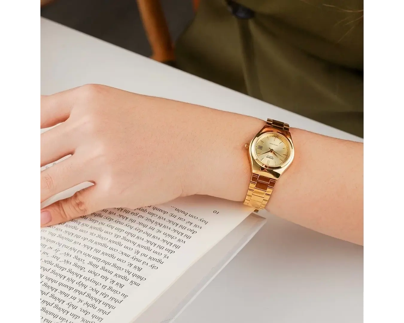 Zegarek damski Casio LTP-1170N-9A to wyjątkowy wyraz subtelności i elegancji dla nowoczesnych kobiet. Jego złota bransoleta i koperta doskonale komponują się, tworząc delikatny, a jednocześnie wyrazisty akcent.