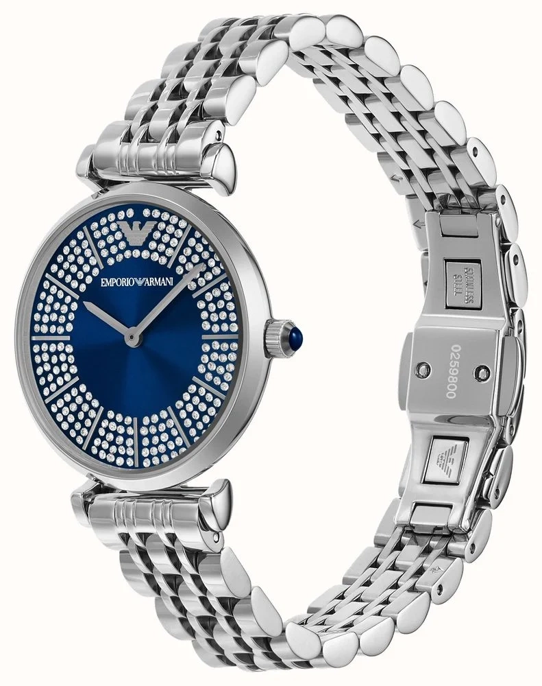 Damski zegarek Emporio Armani AR11627 z serii Gianni T-Bar to elegancki damski zegarek idealny na każdą okazję. Koperta oraz bransoleta zostały wykonane ze stali szlachetnej, co gwarantuje wieloletnią odporność na zniszczenie. Model posiada dokładny mechanizm kwarcowy zasilany baterią. Granatową tarczę zdobioną cyrkoniami zabezpiecza odporne na zarysowania szkło mineralne.