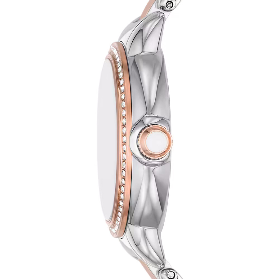 Zegarek Emporio Armani AR11569 to wyjątkowy damski model, który zachwyca eleganckim, wykończeniem w kolorze srebrnym i różowego złota. Stalowa bransoleta z delikatnością oplata nadgarstek, a tarcza zegarka staje się prawdziwym symbolem luksusu, zdobiona kryształkami, które subtelnie wskazują godziny. Perłowa tarcza emanuje subtelnym blaskiem, natomiast biżuteryjny bezel doskonale dopełnia całość, podkreślając wyjątkowy charakter tego czasomierza. Połączenie klasycznego wzornictwa z nowoczesnym stylem sprawia, że zegarek stanowi idealny wybór na każdą okazję, stanowiąc oszałamiający akcent w każdej kolekcji biżuterii.