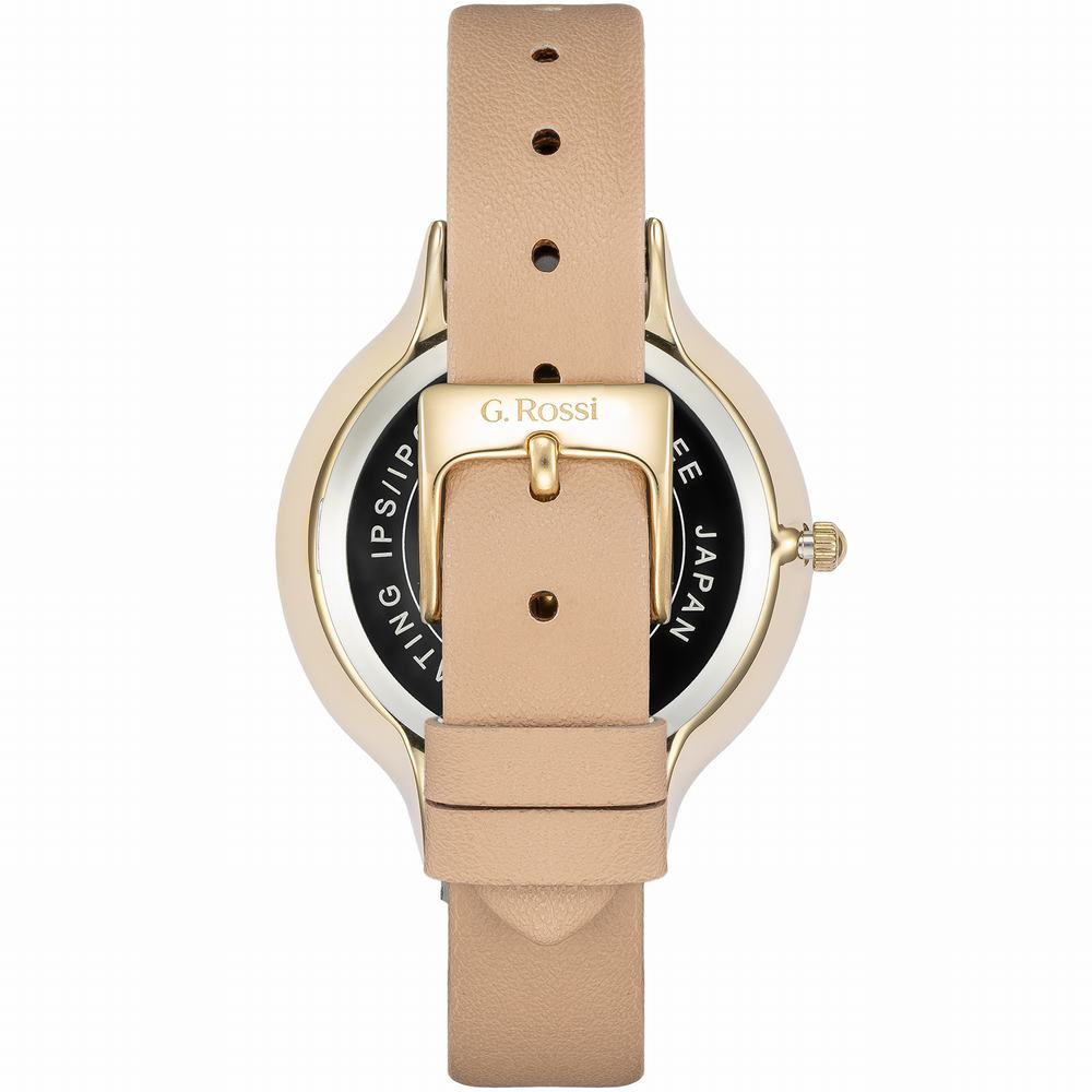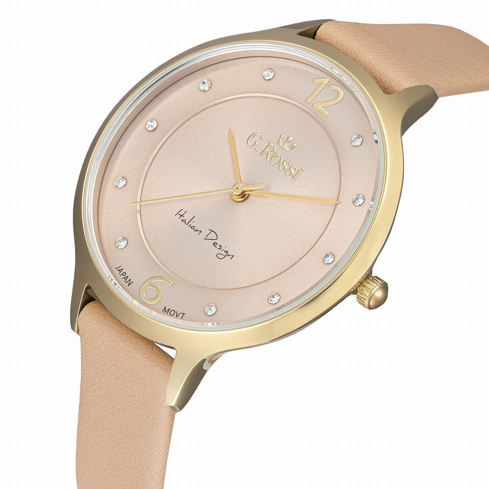 Zegarek damski G. ROSSI G.R10411A-2B2 to elegancka propozycja na co dzień, która łączy subtelną kobiecość z wyjątkowym stylem. Z beżowym paskiem ze skóry, kopertą w złotym odcieniu i beżową tarczą, prezentuje się bardzo szykownie. Indeksy na tarczy to delikatne kryształki, które dodają mu blasku i finezji. Zegarek posiada wodoodporność na poziomie WR30, co zapewnia komfort użytkowania w codziennych sytuacjach. Idealny wybór dla kobiet ceniących elegancję, ale szukających także praktyczności w swoich dodatkach.