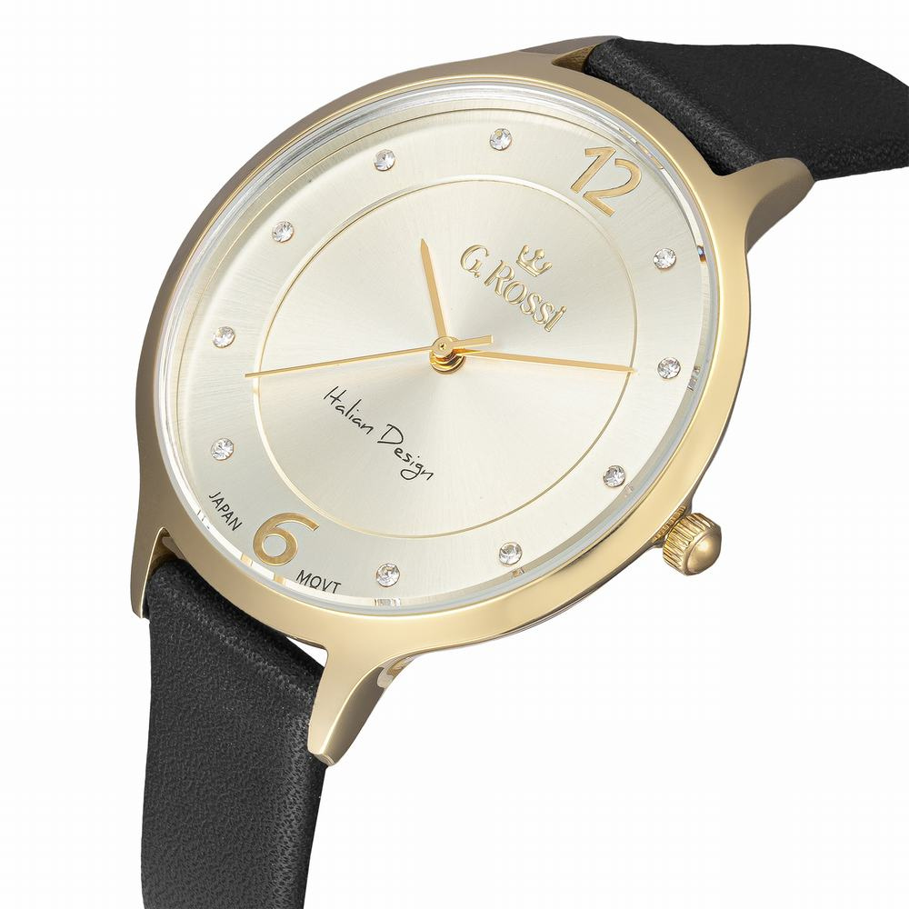 Zegarek damski G. ROSSI G.R10411A-4A1 to elegancka propozycja na co dzień, która łączy subtelną kobiecość z wyjątkowym stylem. Z czarnym paskiem ze skóry, kopertą w złotym odcieniu i złotą tarczą, prezentuje się bardzo szykownie. Indeksy na tarczy to delikatne kryształki, które dodają mu blasku i finezji. Zegarek posiada wodoodporność na poziomie WR30, co zapewnia komfort użytkowania w codziennych sytuacjach. Idealny wybór dla kobiet ceniących elegancję, ale szukających także praktyczności w swoich dodatkach.