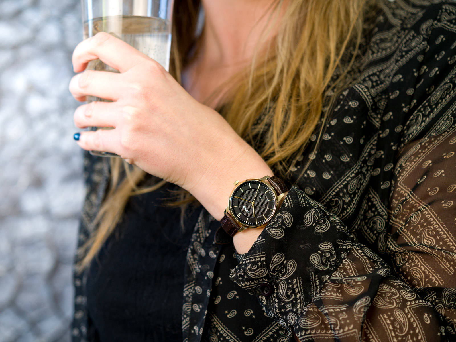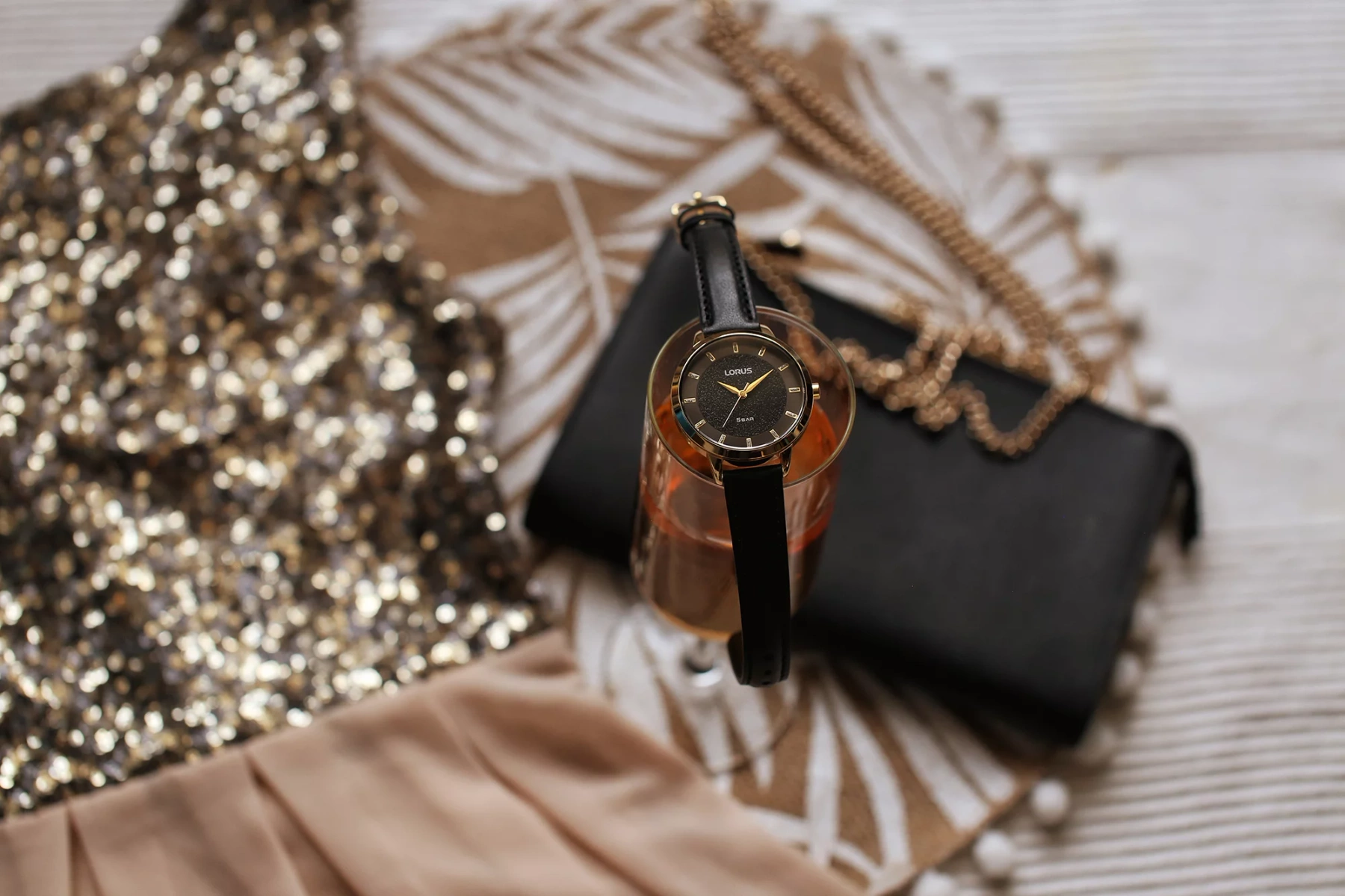 Czarna tarcza z subtelnymi złotymi detalami tworzy harmonijny kontrast, nadając zegarkowi nowoczesny i stylowy wygląd. Złote indeksy i wskazówki dodają mu elegancji, jednocześnie zwiększając czytelność.