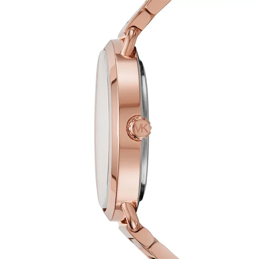 Zegarek Michael Kors Parker MK3549 to bardzo efektowny i kobiecy dodatek zarówno do sportowych jak i casualowych stylizacji. Tarcza z dużym logo MK oraz tarcza zdobiona kryształkami. Koperta i bransoleta wykonana ze stali szlachetnej w kolorze różowozłotym. Zastosowane szkło mineralne. Zegarek posiada szczelność na poziomie 50 m co oznacza, że jest odporny na niewielkie zachlapanie.