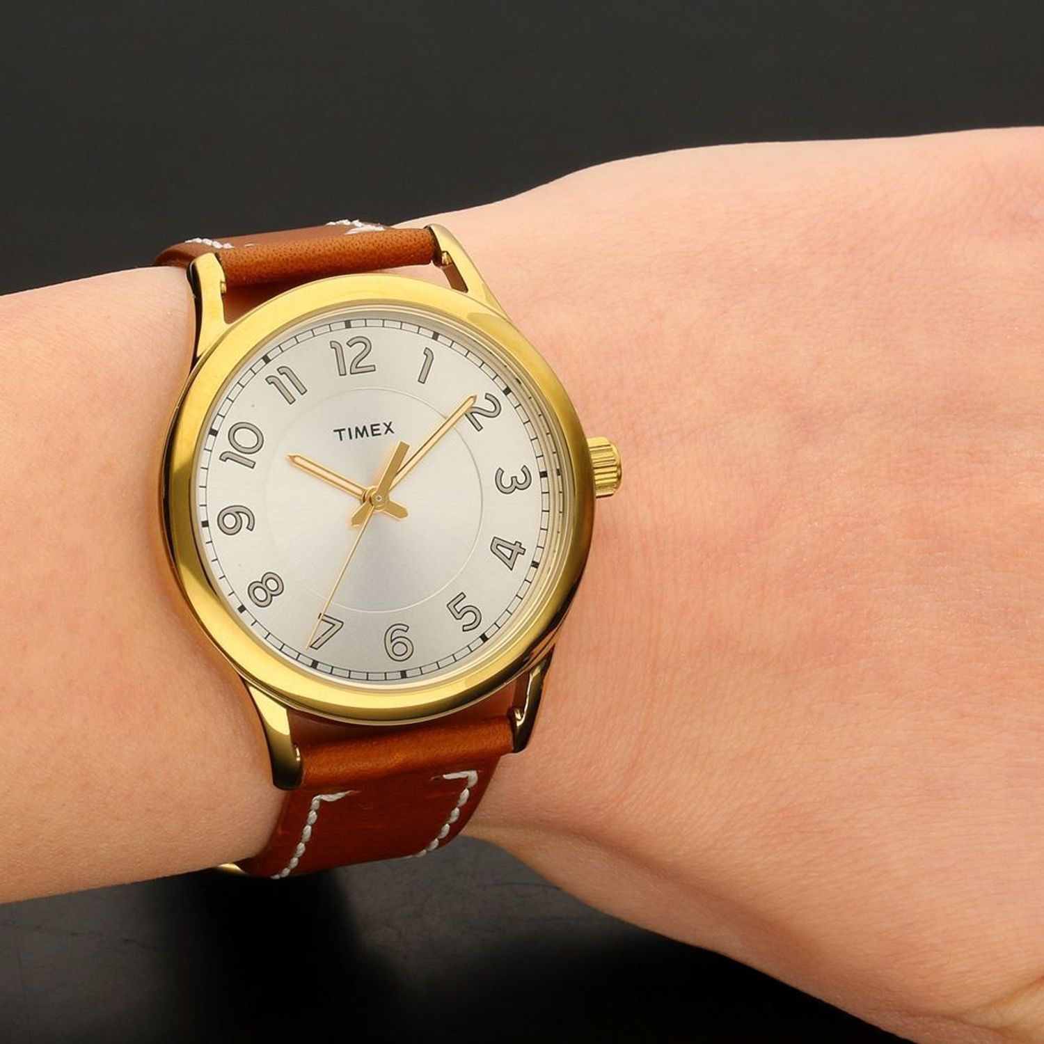 Timex TW2R23000 New England to elegancki zegarek damski z klasyczną, złotą kopertą, brązowym skórzanym paskiem i czytelną, srebrną tarczą. Wyposażony w precyzyjny mechanizm kwarcowy i odporny na zachlapania, idealnie sprawdzi się na co dzień i do eleganckich stylizacji.