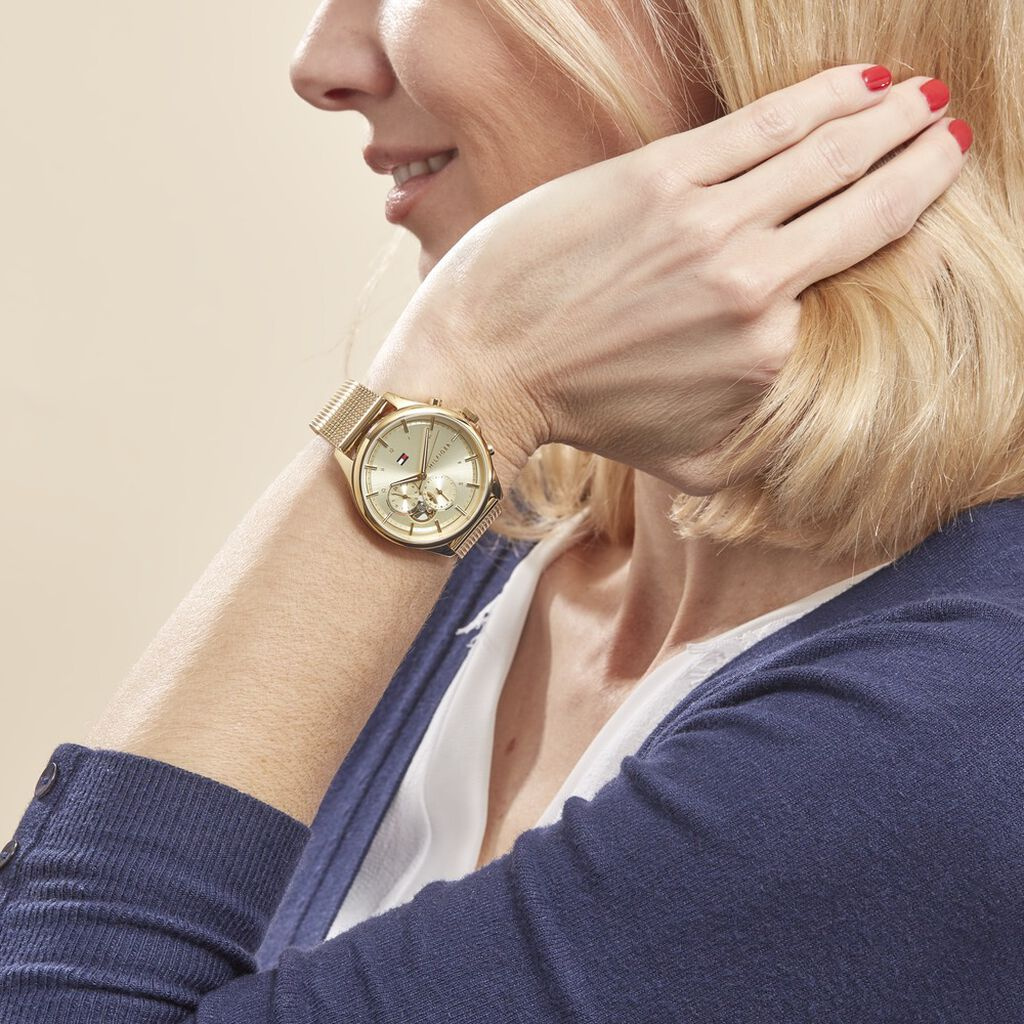Zegarek damski Tommy Hilfiger 1782417 Quinn to elegancka i kobieca propozycja dla wymagających pań. Posiada kopertę oraz bransoletę ze stali szlachetnej w subtelnym złotym kolorze, które nadają mu klasycznego charakteru. Tarcza również w odcieniu złota, pokryta szkłem mineralnym, emanuje elegancją i subtelnością. Dodatkowo zegarek wyposażono w 24-godzinną tarczę oraz funkcjonalny datownik, co zwiększa jego praktyczność. Model charakteryzuje się wodoszczelnością 3ATM, co pozwala na bezpieczne użytkowanie w codziennych warunkach. Zapięcie klamrowe zapewnia komfort i pewność noszenia zegarka przez cały dzień.