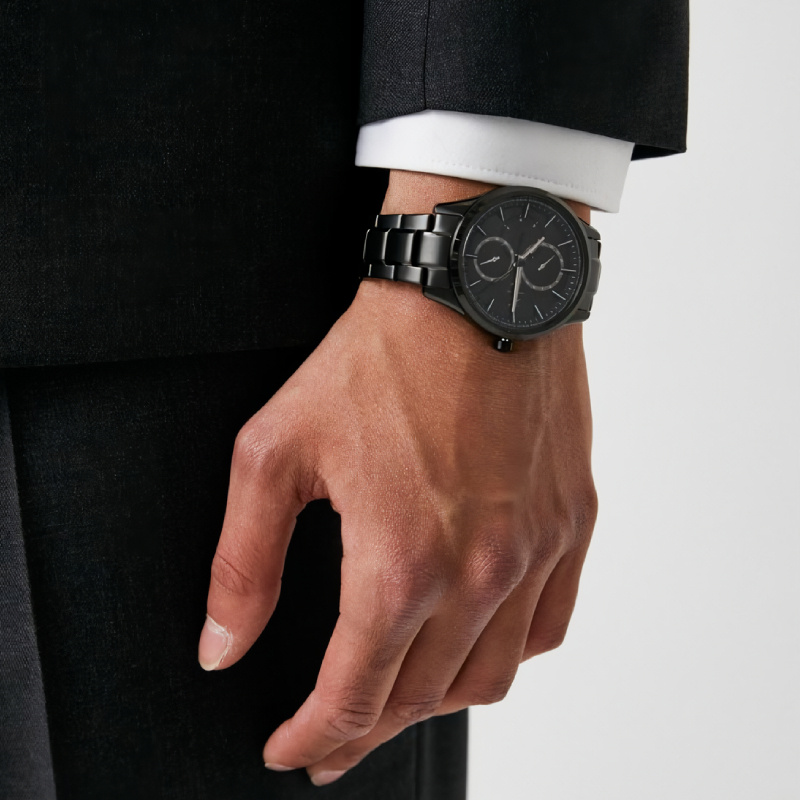 Zegarek Armani Exchange Dante AX1867 to elegancki model, który wyróżnia się minimalistycznym, ale nowoczesnym designem. Koperta o szerokości 42 mm, wykonana z wysokiej jakości stali szlachetnej, jest utrzymana w czarnym kolorze, co nadaje zegarkowi elegancki, ponadczasowy wygląd. Czarnej tarczy towarzyszą srebrna indeksy i wskazówki, które subtelnie podkreślają jej styl. Zegarek wyposażono w bransoletę wykonaną również ze stali szlachetnej, co zapewnia wygodę i trwałość.