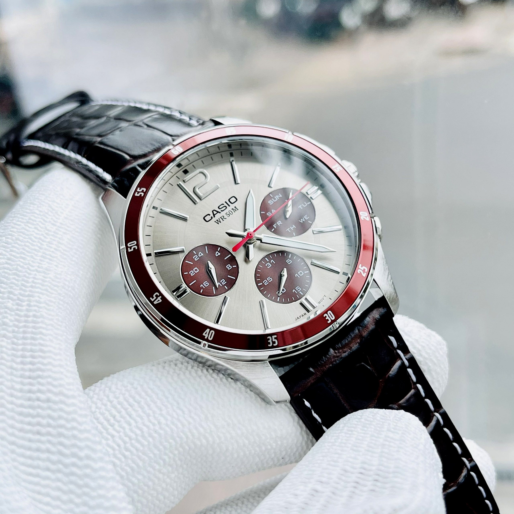 Casio MTP-1374L-7A1V  to zegarek kwarcowy, co zapewnia precyzyjne odmierzanie czasu, a jego mechanizm działa niezawodnie, gwarantując dokładność nawet przy codziennym użytkowaniu. Zegarek cechuje się również wodoszczelnością na poziomie 50M, co sprawia, że jest odporny na drobne zachlapania i kontakt z wodą – idealny do codziennego użytkowania, także w deszczowe dni.