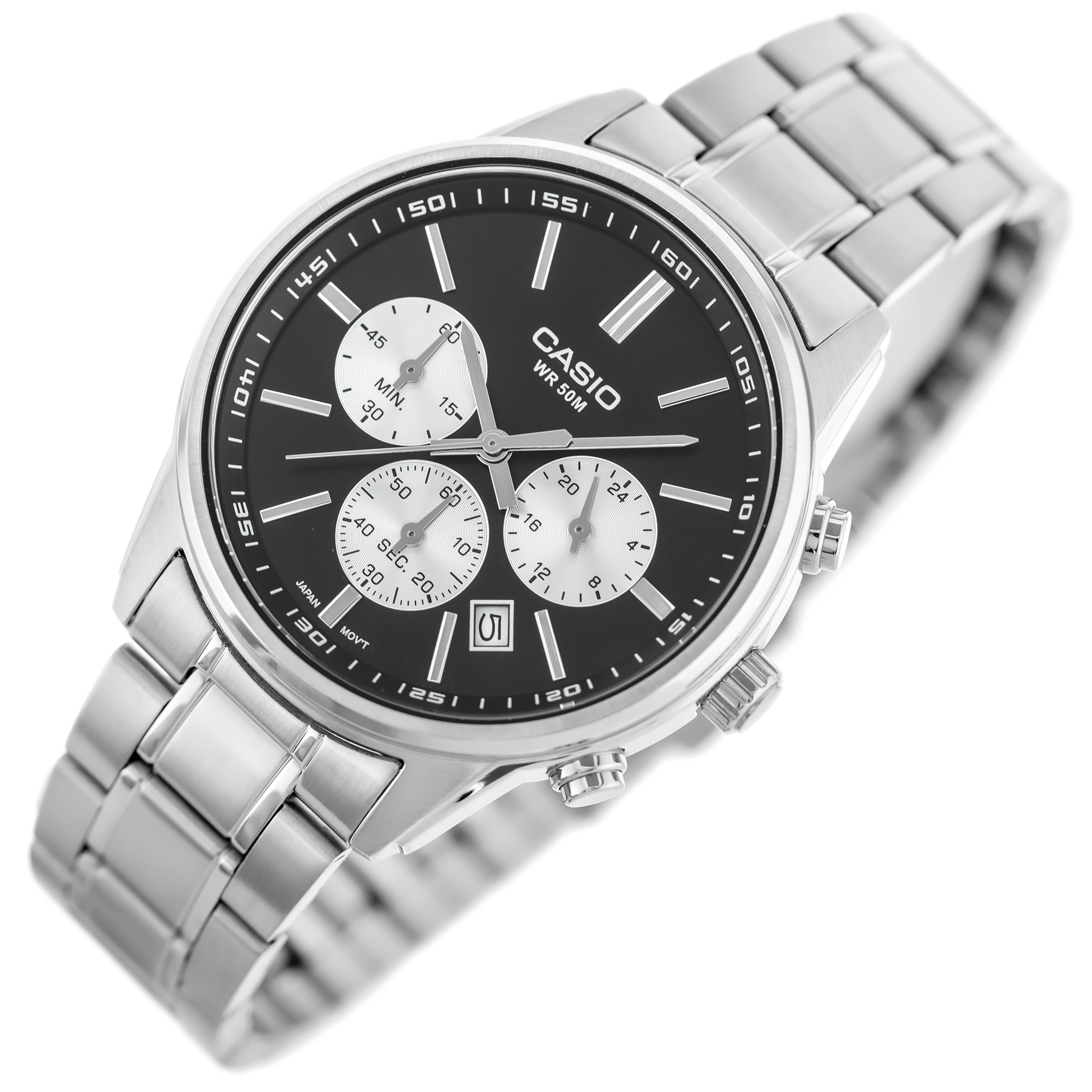 Zegarek męski CASIO MTP-E515D-1A  to połączenie nowoczesnego designu, funkcjonalności i niezawodności, które sprawia, że ten model staje się idealnym towarzyszem dla każdego mężczyzny ceniącego sobie styl i praktyczność. Jego okrągła, stalowa koperta w srebrnym odcieniu emanuje wyrafinowanym charakterem, a jednocześnie prezentuje się niezwykle uniwersalnie, pasując zarówno do codziennych, casualowych stylizacji, jak i bardziej formalnych okazji. Tarcza zegarka, utrzymana w grafitowej kolorystyce, została ozdobiona srebrnymi indeksami oraz smukłymi wskazówkami, które zapewniają doskonałą czytelność czasu. Subtelne akcenty w postaci chronografu i datownika dodają całości dynamizmu i praktycznego wymiaru, czyniąc ten zegarek nie tylko stylowym, ale i funkcjonalnym dodatkiem.