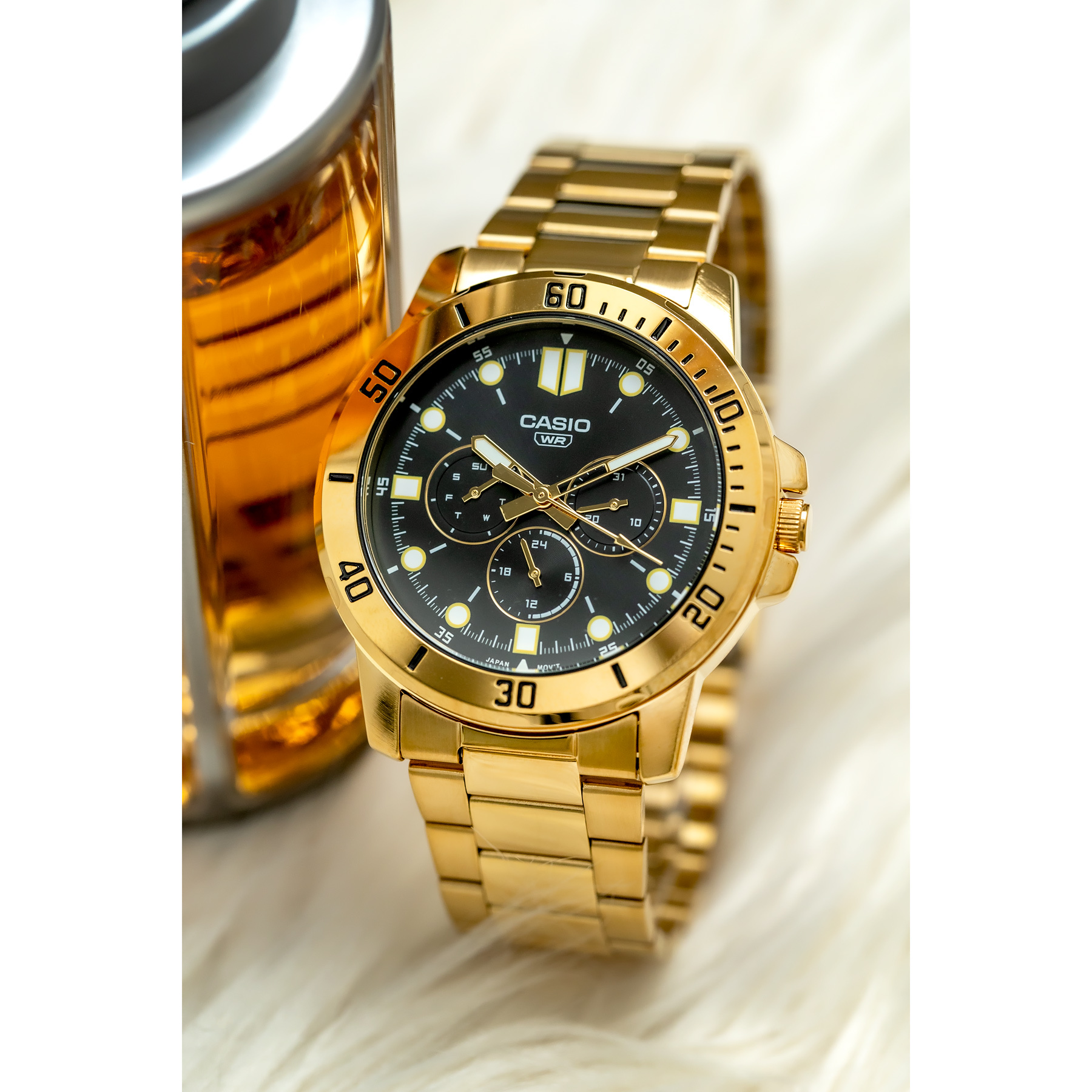 Wzbogacony o złocone akcenty, model MTP-VD300G-1EUDF zyskuje na wyjątkowym charakterze, będąc jednocześnie eleganckim dodatkiem do codziennych stylizacji, jak i tym, który będzie idealnie pasował do bardziej formalnych okazji. Złote indeksy i wskazówki, subtelnie wyróżniające się na tle ciemnej tarczy, nadają zegarkowi niepowtarzalny wygląd, który nigdy nie wyjdzie z mody.