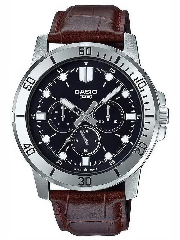 Wzbogacony o srebrne akcenty, model MTP-VD300L-1E zyskuje na wyjątkowym charakterze, będąc jednocześnie eleganckim dodatkiem do codziennych stylizacji, jak i tym, który będzie idealnie pasował do bardziej formalnych okazji. Srebrne indeksy i wskazówki, subtelnie wyróżniające się na tle ciemnej tarczy, nadają zegarkowi niepowtarzalny wygląd, który nigdy nie wyjdzie z mody.