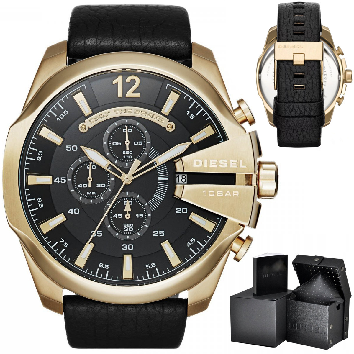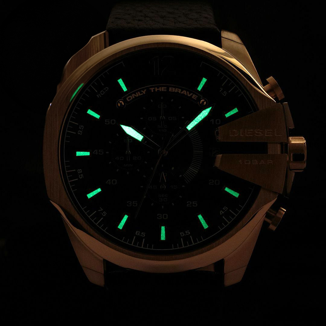 Zegarek marki Diesel Mega Chief DZ4344 napędza japoński mechanizm kwarcowy, zasilany baterią o średniej żywotności 2 lat. Ciemny cyferblat czasomierza, pokryto bardzo odpornym szkiełkiem mineralnym. Kopertą wykonana ze stali szlachetnej, pasek wykonany z wytrzymałej, naturalnej skóry. Do zalet zegarka DIESEL DZ4304 możemy zaliczyć m.in: datownik w formie okienka na tarczy zlokalizowany na poziomie godziny 3;00, na którym można odczytać aktualną datę, oraz stoper w formie chronografu odmierzający czas do 60 minut z dokładnością do 1/10 sekundy. Warto dodać, że wskazówki pokryto warstwą fosforyzującą, która delikatnie podświetla się w ciemnościach. Czasomierz posiada wodoszczelność na poziomie 10TM tj. 100m, która pozwala na swobodne pływanie. Produkt marki DIESEL jest w stu procentach oryginalny, objęty 24 miesięczną gwarancją.