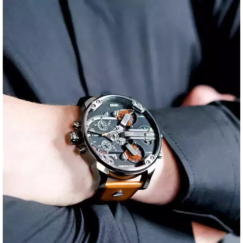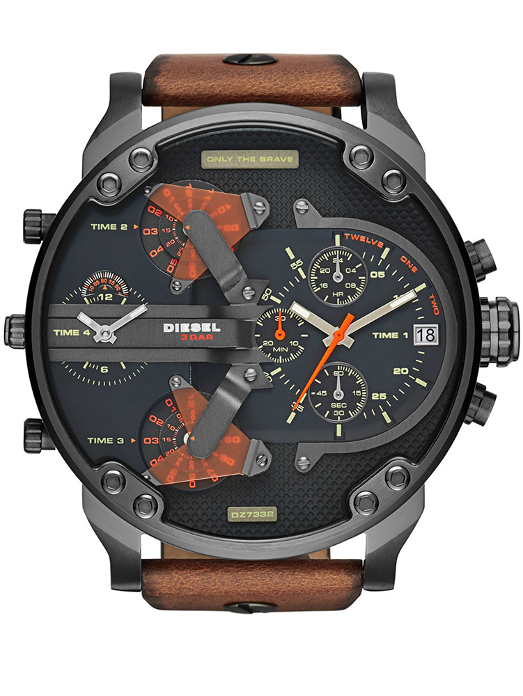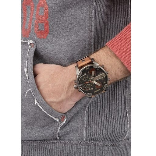Zegarek męski Diesel Mr. Daddy 2.0 DZ7332 to duży męski zegarek. Brązowy skórzany pasek doskonale komponuje się z czarną kopertą, którą wykonano z hipoalergicznej stali szlachetnej. Na tarczy zamontowano 4 oddzielne mechanizmy mierzenia czasu. Całość pokryta szkłem mineralnym gwarantuje wytrzymałość na zarysowania i pęknięcia. Wodoodporność na 30 metrów chroni przed zachlapaniem. Zastosowany mechanizm kwarcowy jest niezawodny. Model Diesel Mr. Daddy 2.0 DZ7332 to połączenie niewymuszonej elegancji ze sportowym charakterem – musi przyciągać uwagę!