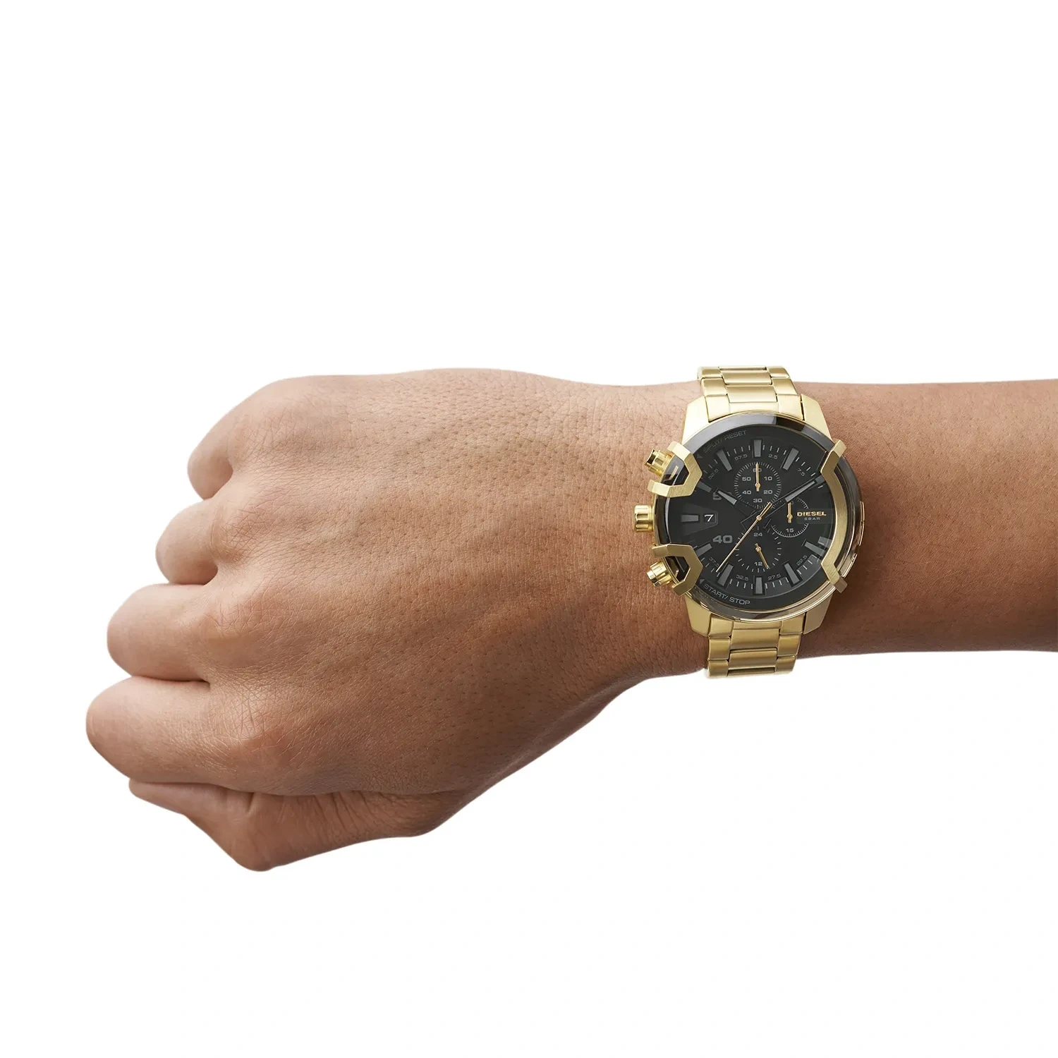 Zegarek Diesel Griffed DZ4522 to wybór dla mężczyzn, którzy cenią sobie wyraziste akcenty w złotym kolorze. Jego elegancka konstrukcja obejmuje okrągłą kopertę oraz bransoletę ze stali nierdzewnej, odpornej na korozję, a także analogowy cyferblat chroniony szkiełkiem mineralnym. Na tarczy znajdziesz datownik oraz subtarcze dla chronografu. Koronka i przyciski do obsługi funkcji komplikacji znajdują się po lewej stronie koperty. Z wodoodpornością na poziomie 50 metrów zegarek jest odporny na zachlapania, co zapewnia ochronę mechanizmu kwarcowego.