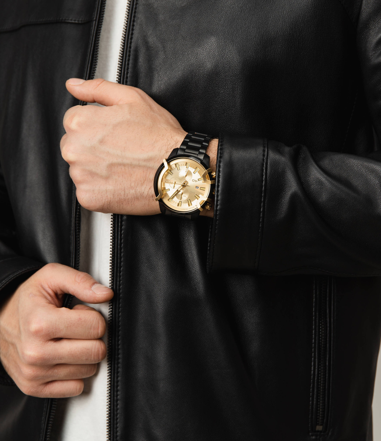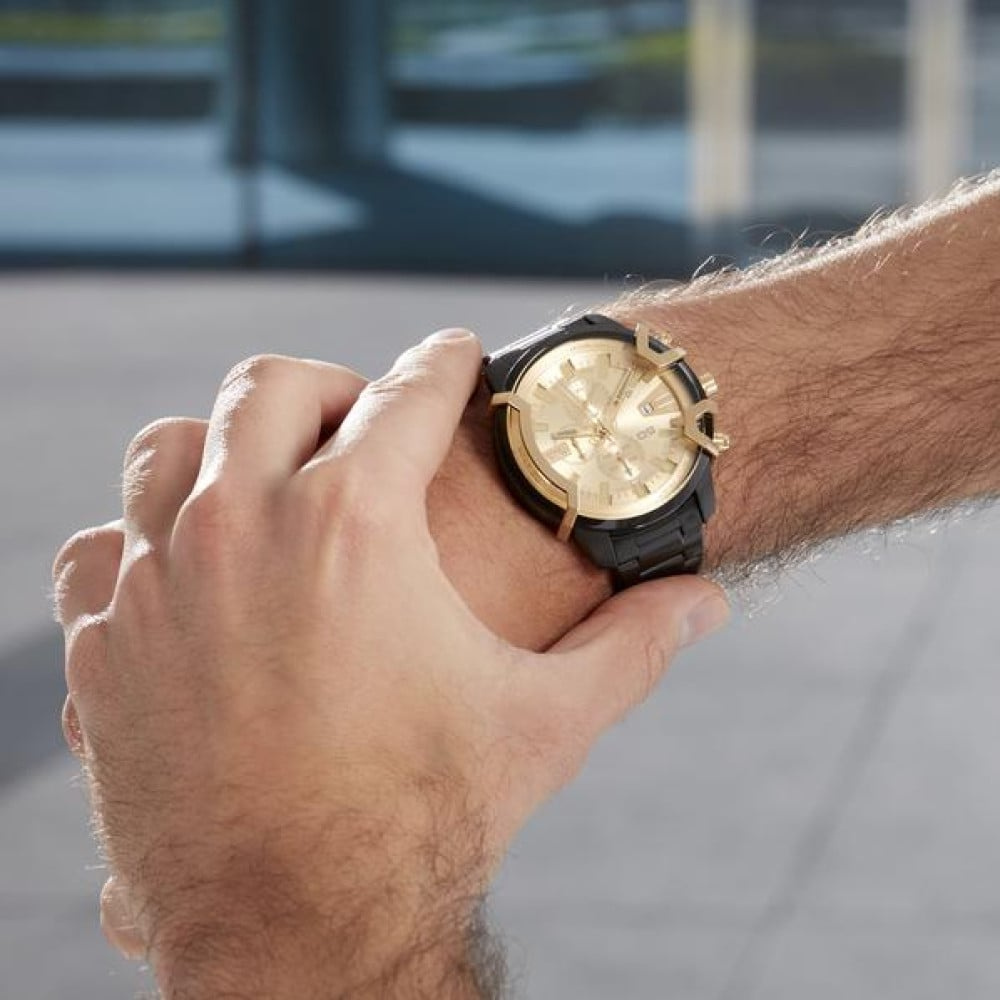 Zegarek Diesel Griffed DZ4525 to wybór dla mężczyzn, którzy cenią sobie wyraziste akcenty w czarnym i złotym kolorze. Jego elegancka konstrukcja obejmuje okrągłą kopertę oraz bransoletę ze stali nierdzewnej, odpornej na korozję, a także analogowy cyferblat chroniony szkiełkiem mineralnym. Na tarczy znajdziesz datownik oraz subtarcze dla chronografu. Koronka i przyciski do obsługi funkcji komplikacji znajdują się po lewej stronie koperty. Z wodoodpornością na poziomie 50 metrów zegarek jest odporny na zachlapania, co zapewnia ochronę mechanizmu kwarcowego.