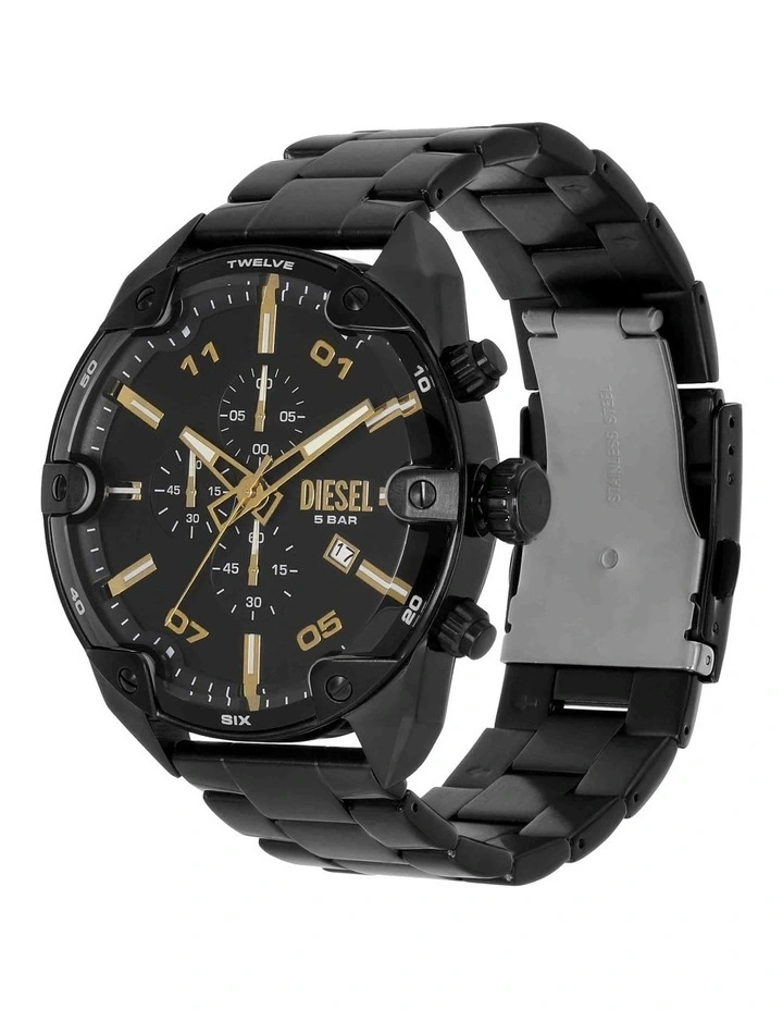 Zegarek męski Diesel Spiked Chronograph DZ4644 łączy elegancję z funkcjonalnością dzięki czarno-złotej kolorystyce. Jego koperta oraz bransoleta wykonane są z wysokiej jakości stali szlachetnej, a tarcza została subtelnie wykończona szlifem. Zabezpieczona szkłem mineralnym, zapewnia trwałość i odporność na uszkodzenia. Model wyposażony jest w datownik, chronograf oraz powłokę luminescencyjną, co zwiększa jego praktyczność. Wodoszczelność na poziomie 5 ATM sprawia, że zegarek jest odporny na kontakt z wodą podczas codziennych czynności.