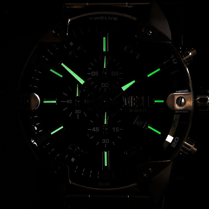 Do zalet zegarka DIESEL DZ4678 możemy zaliczyć m.in: datownik w formie okienka na tarczy zlokalizowany na poziomie godziny 4:00, na którym można odczytać aktualną datę, oraz stoper w formie chronografu odmierzający czas do 60 minut z dokładnością do 1/10 sekundy. Czasomierz posiada wodoszczelność na poziomie 5TM tj. 50m.