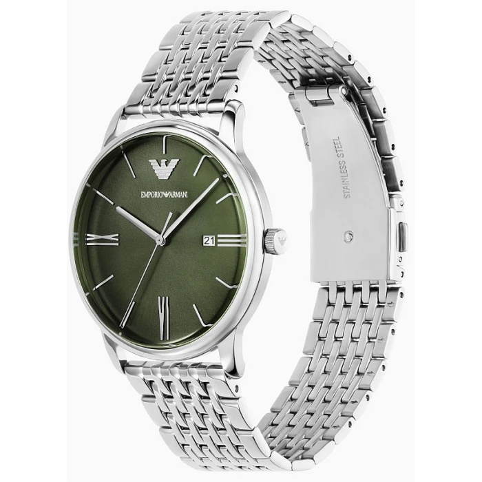 Zegarek Emporio Armani AR11644 to wyjątkowy model, który łączy nowoczesny design z eleganckim wykończeniem. Jego tarcza w kolorze zielonym z subtelnymi srebrnymi detalami nadaje mu charakteru, a stalowa koperta i bransoleta w kolorze srebrnym dodają całości klasy. Dzięki prostemu, ale eleganckiemu wyglądowi, zegarek doskonale sprawdzi się zarówno w codziennych, jak i bardziej formalnych stylizacjach, stanowiąc idealny wybór dla osób ceniących subtelną elegancję.