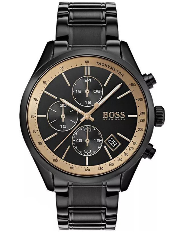 Zegarek męski Hugo Boss 1513578 z serii Grand Prix to niezwykle elegancki męski zegarek, idealny zarówno do eleganckiego ubioru jak i do noszenia na co dzień. Model tego zegarka posiada czarną bransoletę oraz kopertę – obie wykonane ze stali szlachetnej. Na tarczy w kolorach złotym i czarnym zabezpieczonej mineralnym szkłem znajdziemy datownik wskazujący dzień miesiąca oraz subtarcze będące wskazaniami chronografu oraz czasu dobowego.