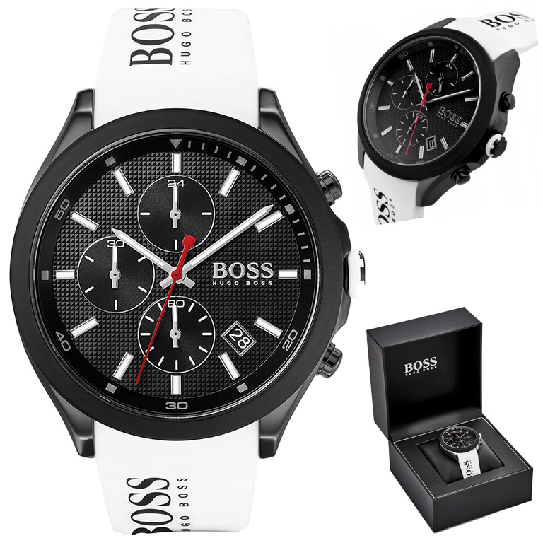 Hugo Boss 1513718 z serii Velocity może być idealną propozycją, dla mężczyzny szukającego markowego uzupełnienia mniej formalnej stylizacji. czarna, stalowa koperta została połączona z czarnym ringiem wykonanym z tworzywa sztucznego. Model ten posiada również komfortowy, biały gumowy pasek, na którym umieszczone jest logo producenta. Zegarek został wyposażony w chronograf oraz rozbudowany datownik, wskazujący dzień miesiąca i godzinę w formacie 24 godzinnym. Model Hugo Boss 1513718 pochodzi z serii Black, w komplecie dołączone jest eleganckie czarne opakowanie, które idealnie sprawdzi się na prezent.