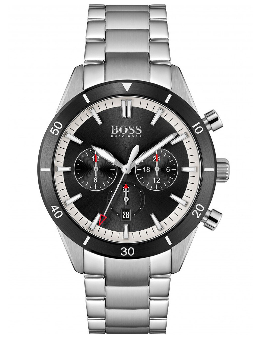 Zegarek męski Hugo Boss 1513862 z serii Santiago to gustowny męski zegarek na każdą okazję. Na czarnej tarczy zabezpieczonej trwałym mineralnym szkłem i otoczonej czarnej pierścieniem znajdziemy datownik dnia miesiąca oraz subtarcze będące wskazaniami chronografu oraz czasu dobowego.
