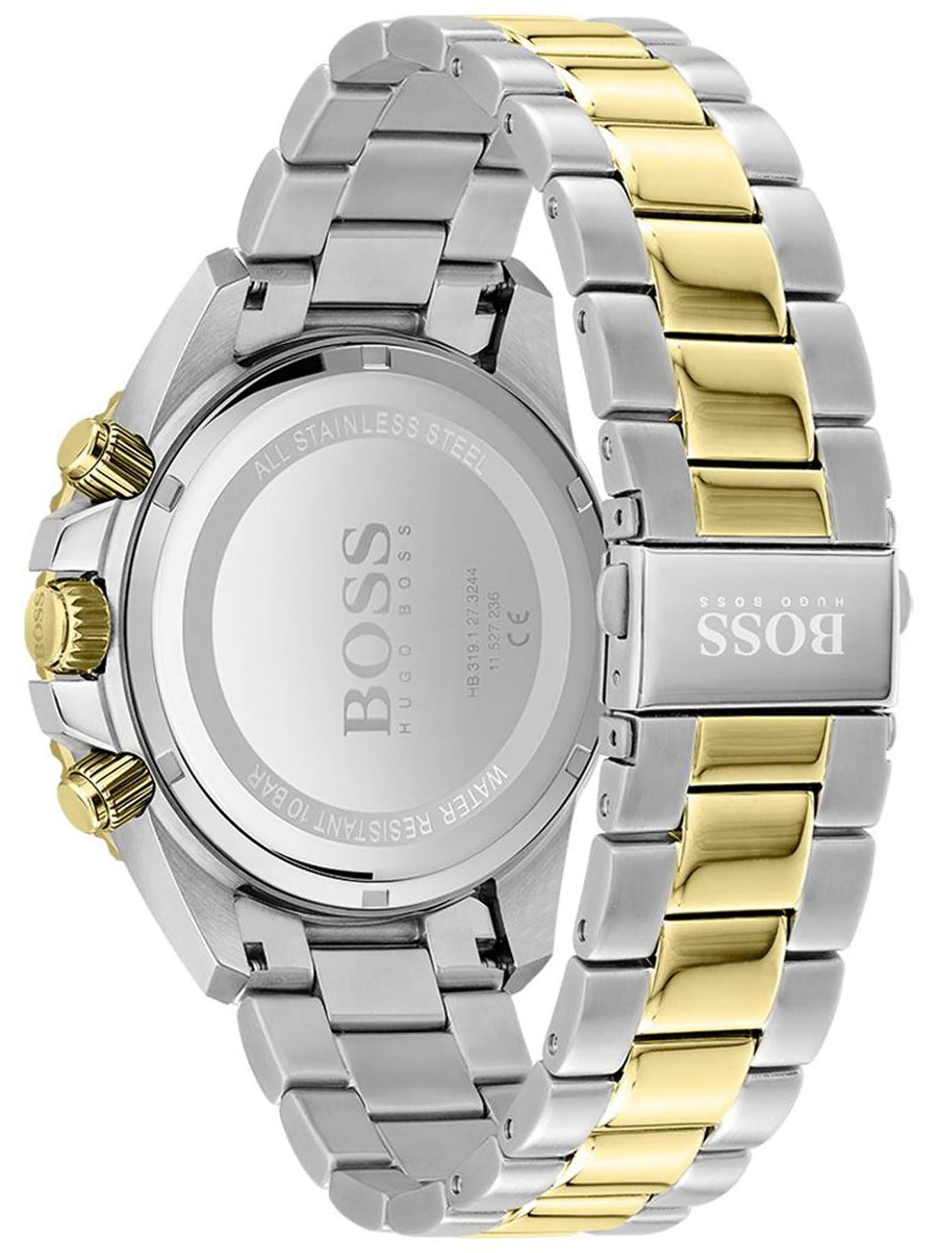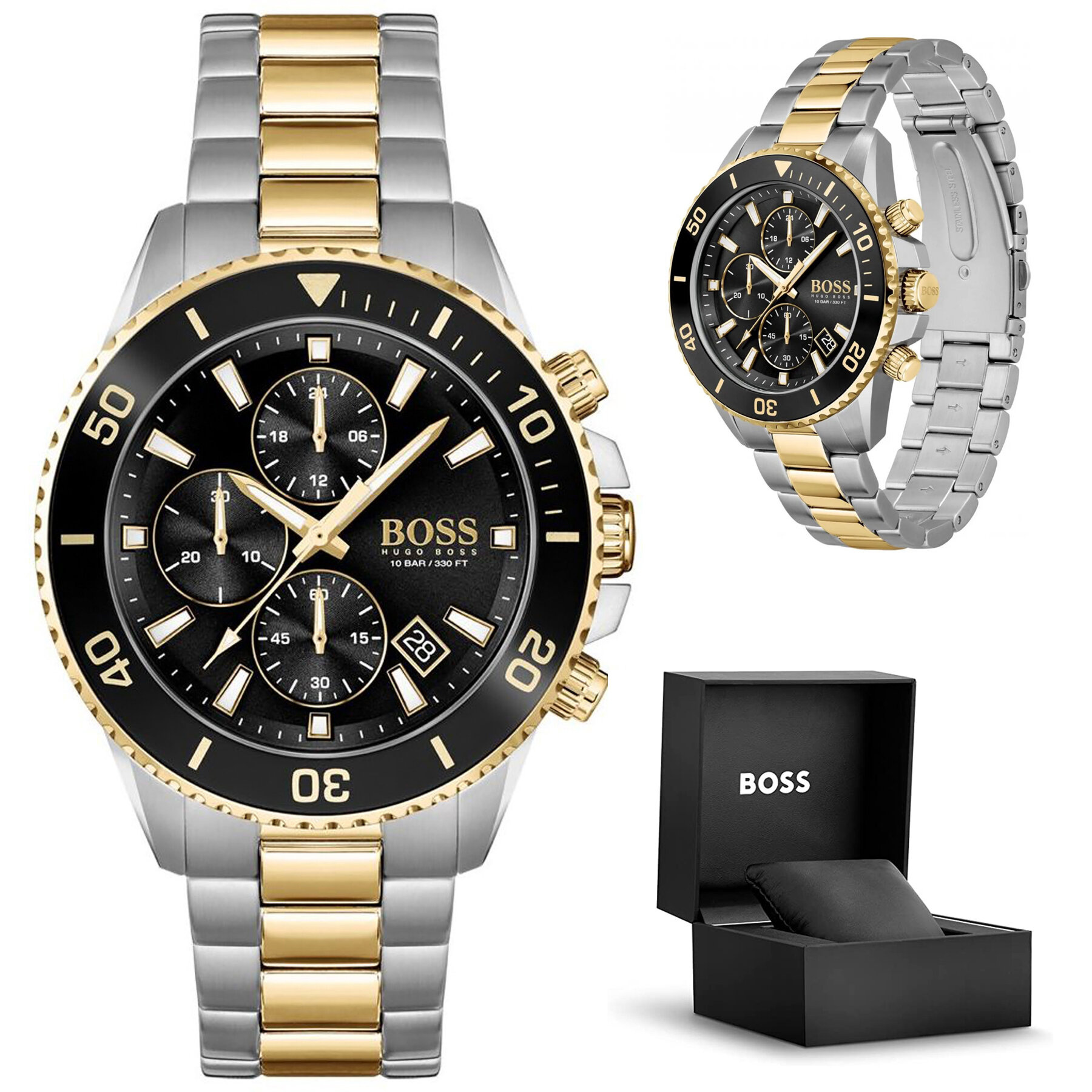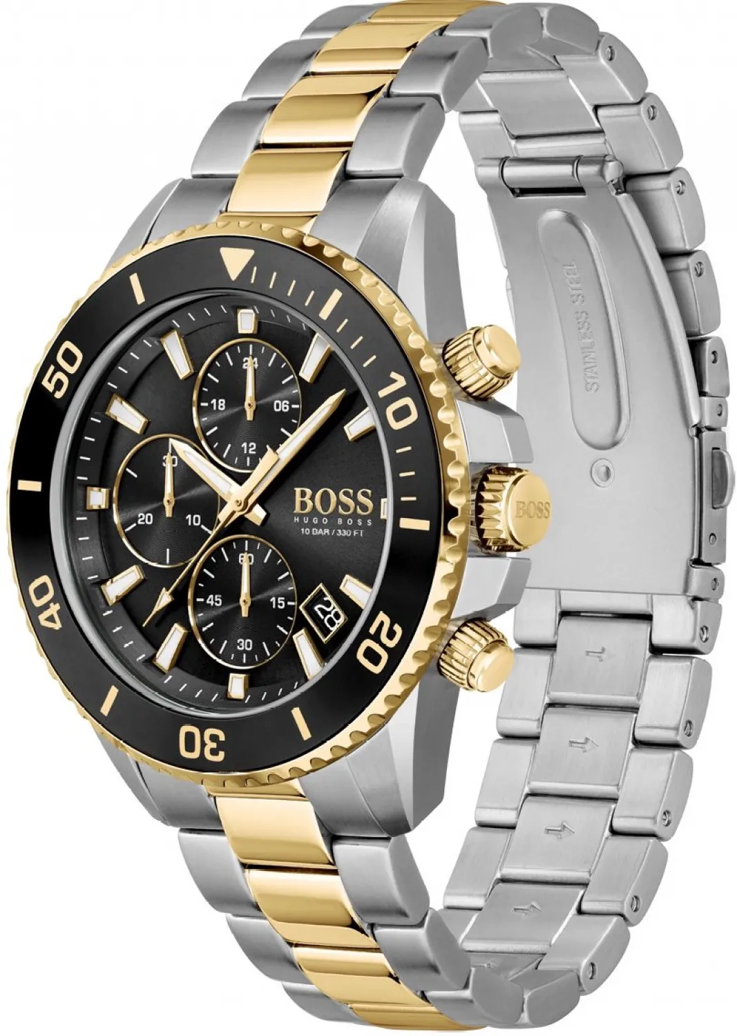 Zegarek męski Hugo Boss 1513908 – Admiral to stylowy męski czasomierz, idealny zarówno do eleganckiego ubioru, jak i sportowych i codziennych stylizacji. Mechanizm kwarcowy zapewnia precyzyjne odmierzanie czasu. Koperta oraz bransoleta zostały wykonane ze stali szlachetnej w odcieniu srebrnym i złotym, co gwarantuje wieloletnią odporność na zniszczenie. Na czytelnej tarczy w kolorze klasycznej czerni zabezpieczonej mineralnym szkłem znajdziemy datownik wskazujący dzień miesiąca oraz subtarcze będące wskazaniami chronografu oraz czasu dobowego. Klasa wodoszczelności czasomierza to WR100, co gwarantuje szczelność zegarka podczas np. pływania.
