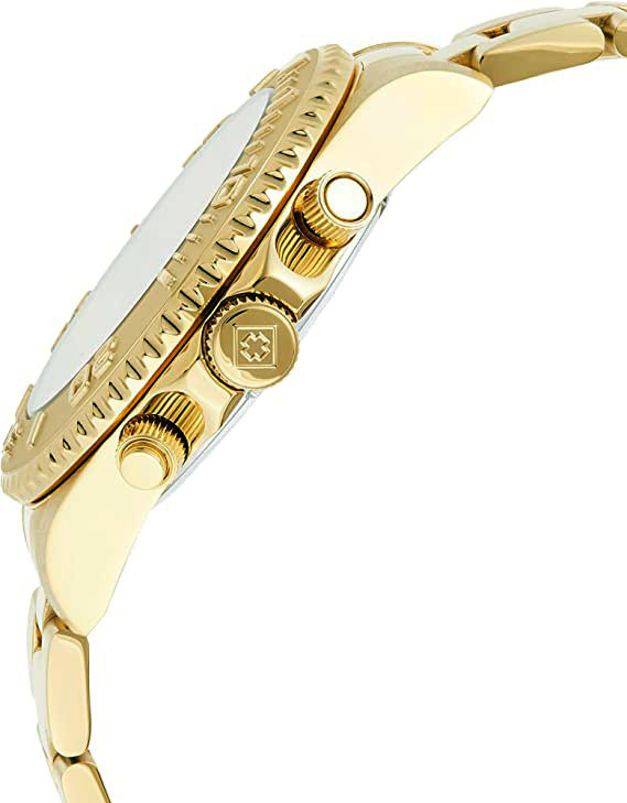 Tarcza w kolorze szampańskim, wyposażona w luminescencyjne wskazówki oraz indeksy. Koperta i bransoleta zegarka całkowicie stalowa, w kolorze złotym.