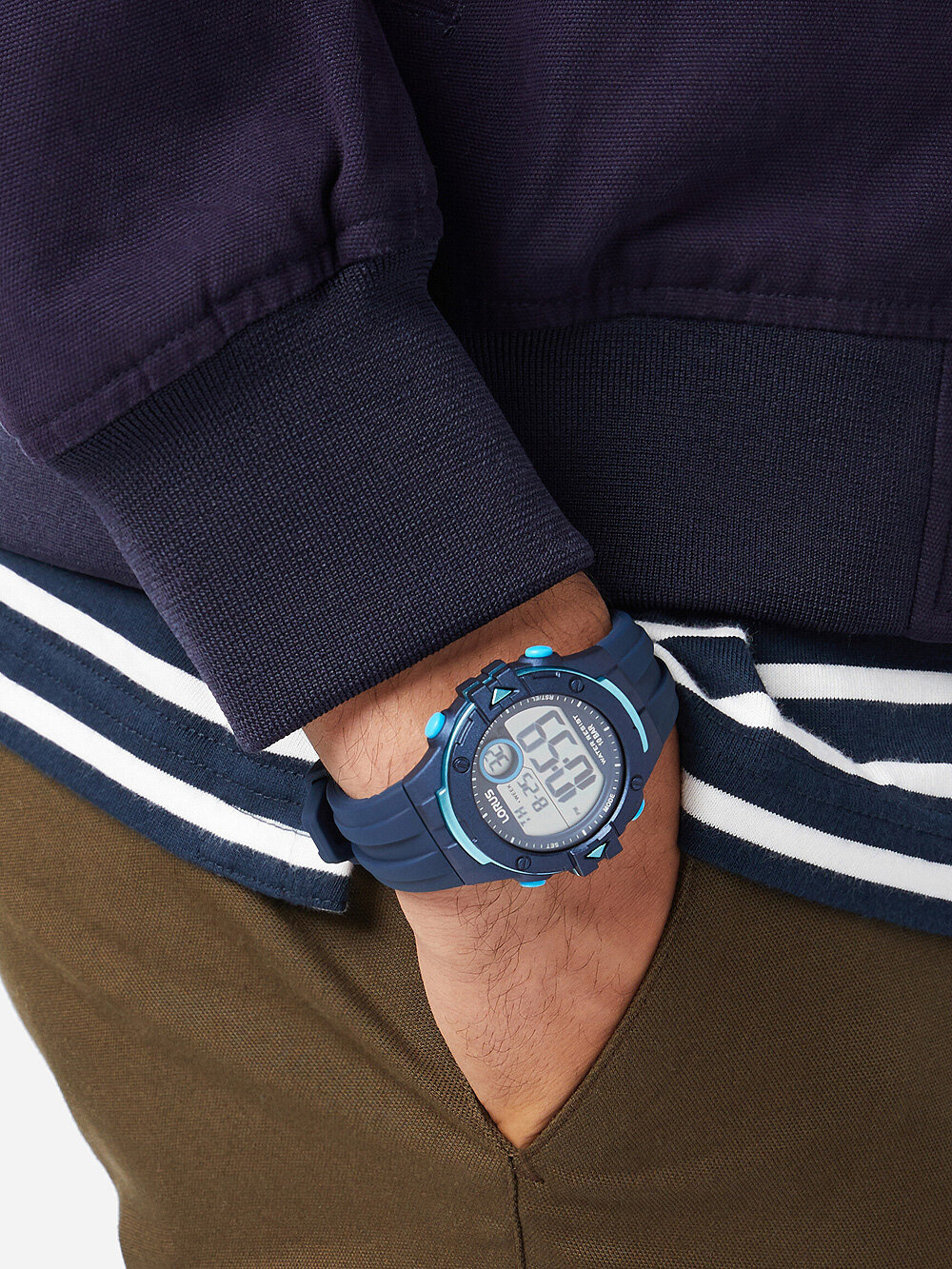 Na czytelnej tarczy tego zegarka znajduje się datownik, a dodatkowo, zegarek wyposażony jest w stoper, timer i alarm, co sprawia, że jest idealnym towarzyszem zarówno podczas codziennych zajęć, jak i podczas aktywności sportowych.