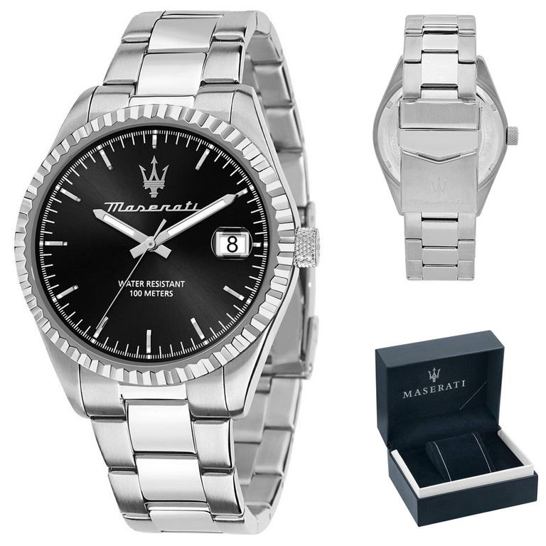 Zegarek Maserati COMPETIZIONE R8853100028 to klasyczny model, który przypadnie do gustu każdemu mężczyźnie. Po zegarki tej marki chętnie sięgają fani włoskiej, luksusowej marki Maserati, jak i osoby poszukujące czasomierza do noszenia na co dzień. Zegarek ten został wykonany w całości ze stali szlachetnej, która jest odporna na korozję. Czarna tarcza z datownikiem przykryta jest szkiełkiem mineralnym. Za niezawodne działanie urządzenia odpowiada dokładny mechanizm kwarcowy zasilany baterią. Zegarek Maserati COMPETIZIONE R8853100028 posiada klasę wodoszczelności 10 ATM, co oznacza, że jest odporny na kontakt z wodą.
