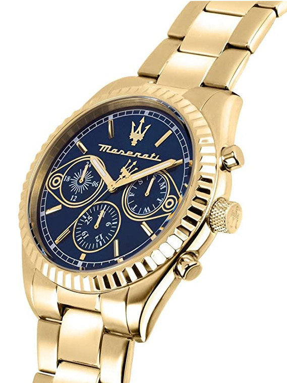 Zegarek Maserati Competizione R8853100026 to elegancki zegarek dla fanów motoryzacji i nie tylko. Na granatowej tarczy zabezpieczonej mineralnym szkłem znajdziemy subtarcze będące wskazaniami dnia tygodnia, dnia miesiąca i czasu dobowego.