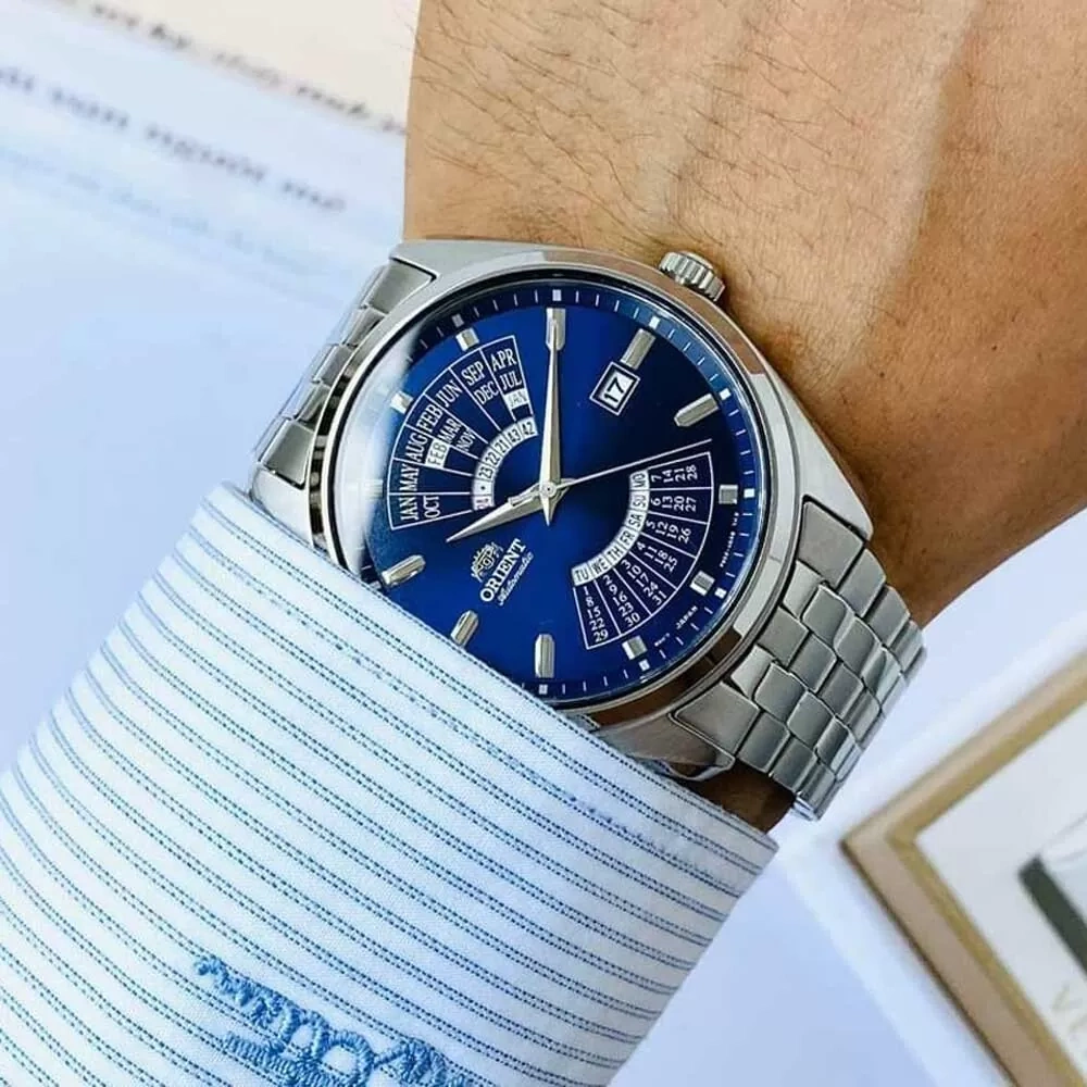 Zegarek Orient Automatic RA-BA0003L10B z serii Multi Year Calendar to klasyczny elegancki zegarek. Czasomierz działa w oparciu o niesłychanie dokładny japoński mechanizm z automatycznym naciągiem. Na niebieskiej tarczy chronionej mineralnym szkłem umieszczono charakterystyczny dla marki kalendarz oraz datowniki dni miesiąca i tygodnia.