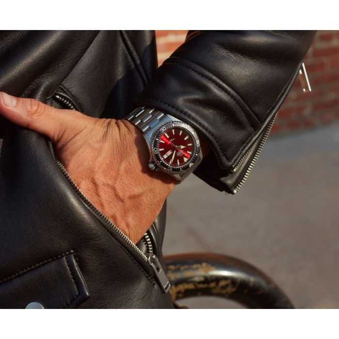 Zegarek Orient Kamasu RA-AA0003R19B to klasyczny elegancki zegarek. Czasomierz działa w oparciu o niesłychanie dokładny japoński mechanizm z automatycznym naciągiem. Na czerwonej tarczy chronionej mineralnym szkłem umieszczono datowniki