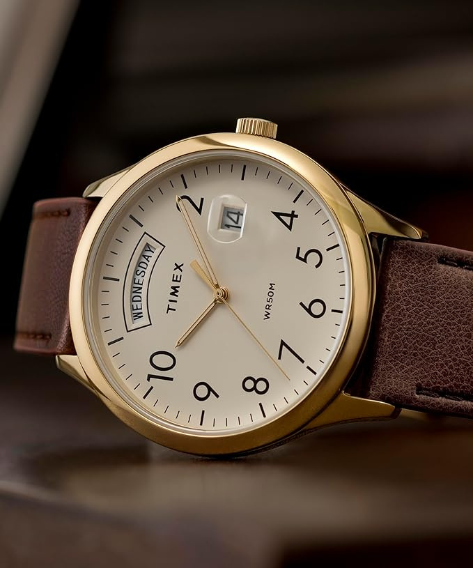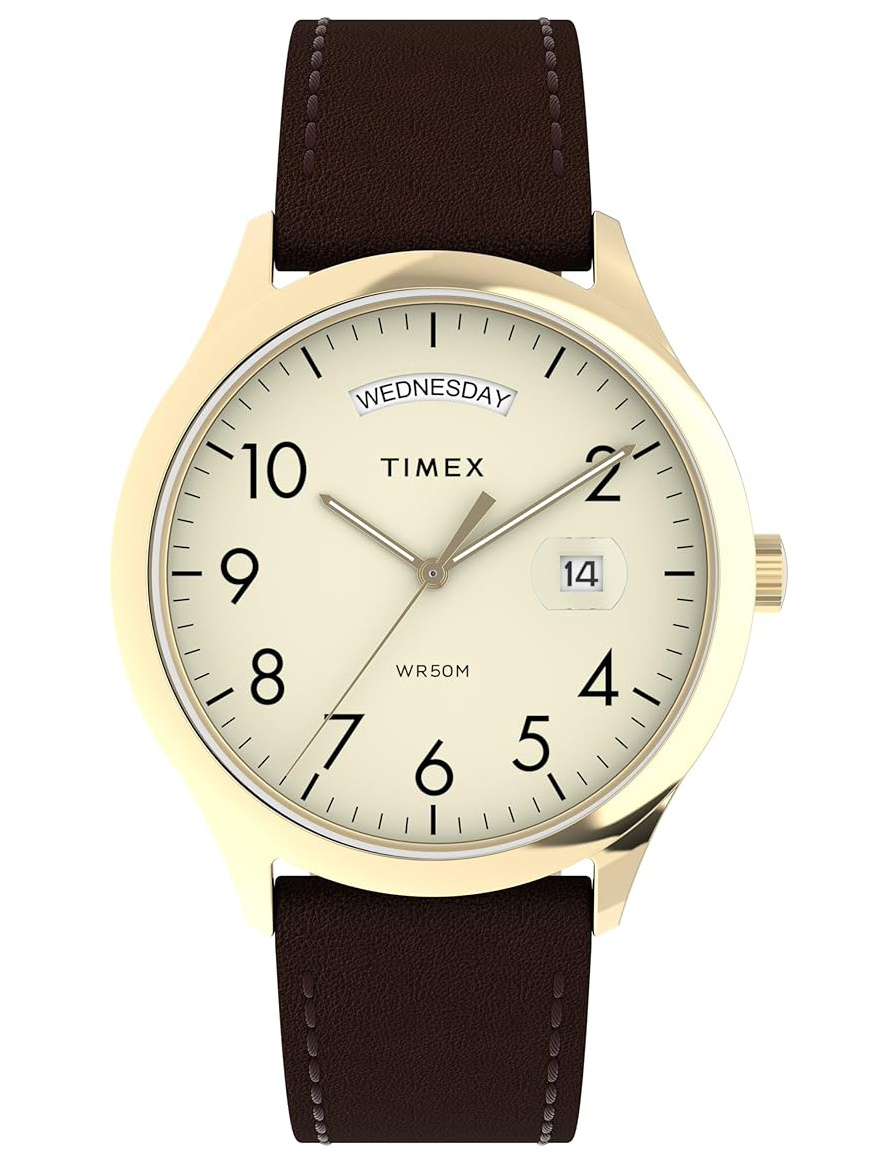 Timex TW2W68400 Modern Easy Reader to elegancki zegarek męski, łączący klasyczny styl z funkcjonalnością. Jego solidna koperta ze stali szlachetnej doskonale współgra z brązowym, skórzanym paskiem, który nie tylko świetnie wygląda, ale także zapewnia komfort noszenia dzięki tradycyjnemu zapięciu na sprzączkę. Beżowa tarcza z wyraźnymi cyframi arabskimi gwarantuje doskonałą czytelność, a praktyczny datownik z lupą przy godzinie trzeciej umożliwia szybkie sprawdzenie dnia miesiąca. Dodatkowo, nad godziną 12 umieszczono wskaźnik dnia tygodnia, co czyni ten model niezwykle przydatnym w codziennym użytkowaniu. Tarczę zabezpiecza trwałe, płaskie szkło mineralne. Aby zapewnić lepszą widoczność w warunkach słabego oświetlenia, wskazówki pokryto powłoką neobrite, która po naświetleniu emituje delikatne światło. Precyzja wykonania, klasyczny design i wysokiej jakości materiały sprawiają, że Timex TW2W68400 Easy Reader to idealny wybór zarówno na co dzień, jak i na bardziej formalne okazje.