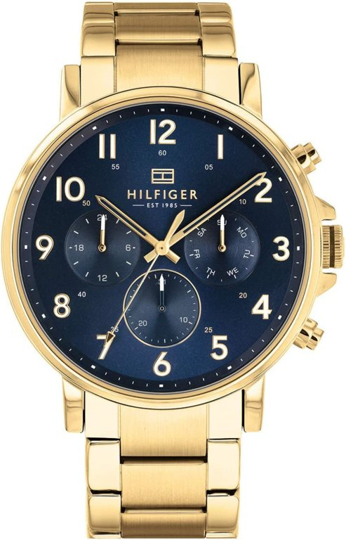 Zegarek męski TOMMY HILFIGER 1710384. Mechanizm kwarcowym. Koperta i bransoleta wykonana ze stali szlachetnej pokrytej powloką w kolorze złota. . Granatową tarczę chroni szkło mineralne. Średnica koperty wynosi 45mm. Dzięki trzem subtarczom z datownikiem dobowym oraz funkcją datownika nie będziemy musieli się martwić, że zapomnieliśmy o umówionych spotkaniach czy ważnych datach.