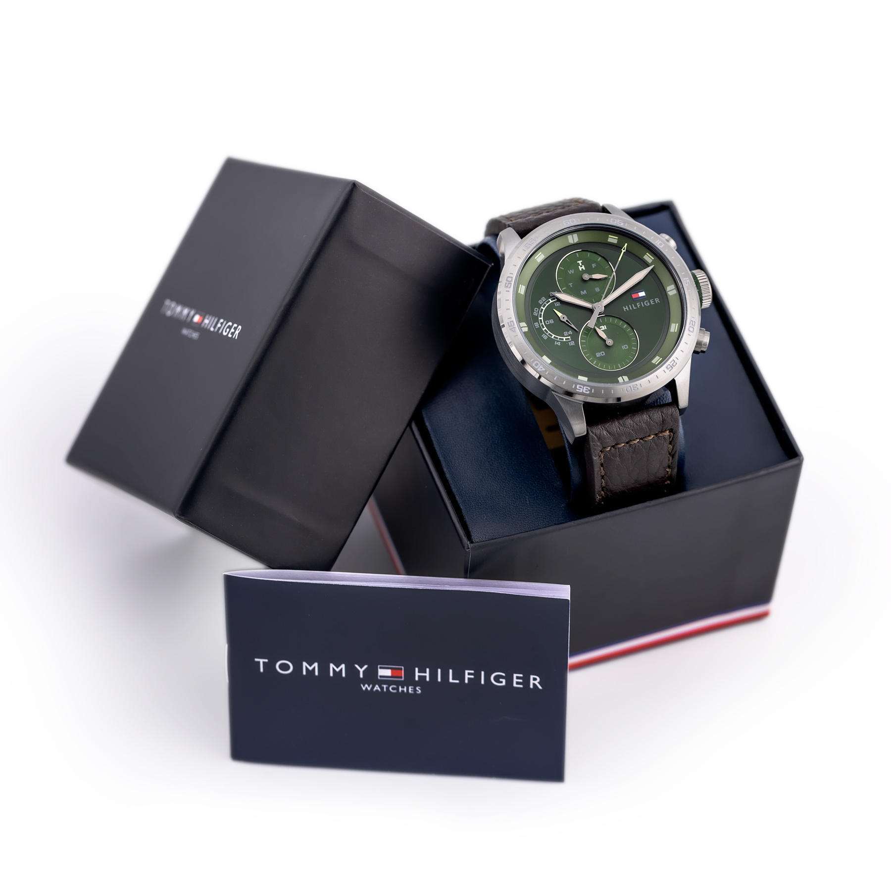 Zegarek Tommy Hilfiger Trent 1791809 to ciekawe i unikatowe zestawienie kolorystyczne: zielona tarcza, brązowy pasek oraz szczotkowana kopertą ze stali szlachetnej. Model 1791809 posiada rozbudowany datownik oraz czas dobowy. Tarcza chroniona szkłem mineralnym, a solidny pasek wykonany z naturalnej skóry. Wodoszczelność zegarka to 5ATM.