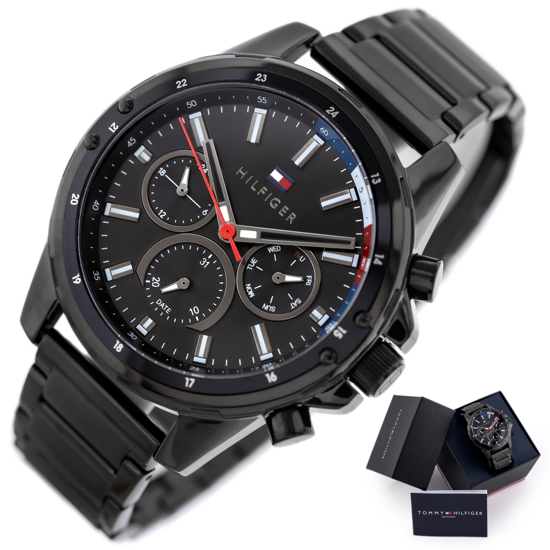 Zegarek męski Tommy Hilfiger 1791935 to modowy model w stylu casual, który pasuje do wielu stylizacji. Koperta oraz bransoleta w kolorze klasycznej czerni wykonana z mocnej stali szlachetnej jest odporna na korozję, szkło mineralne na tarczy jest bardzo odporne na stłuczenia i zarysowania. Tarcza została wyposażona w funkcjonalne tarcze czasu 24h, datownika dni tygodnia oraz datownika dni miesiąca. Wodoszczelność zegarka jest na poziomie 5 ATM, można z nim się bezpiecznie kąpać.