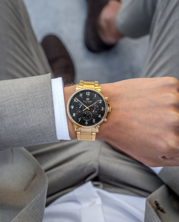 Zegarek męski TOMMY HILFIGER 1791978. Mechanizm kwarcowym. Koperta i bransoleta wykonana ze stali szlachetnej pokrytej powloką w kolorze złota. . Granatową tarczę chroni szkło mineralne. Średnica koperty wynosi 45mm. Dzięki trzem subtarczom z datownikiem dobowym oraz funkcją datownika nie będziemy musieli się martwić, że zapomnieliśmy o umówionych spotkaniach czy ważnych datach.