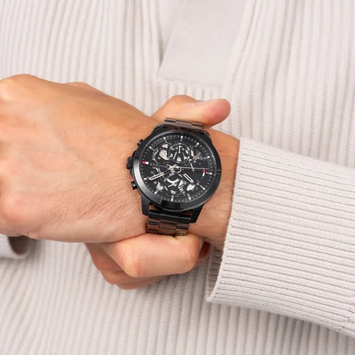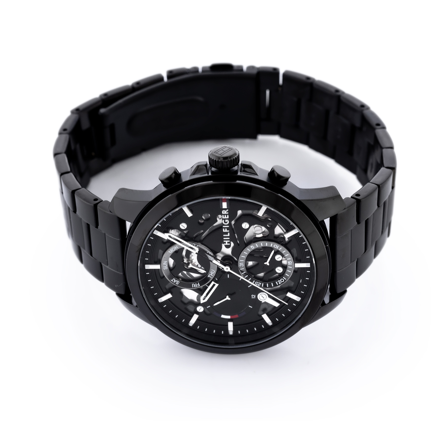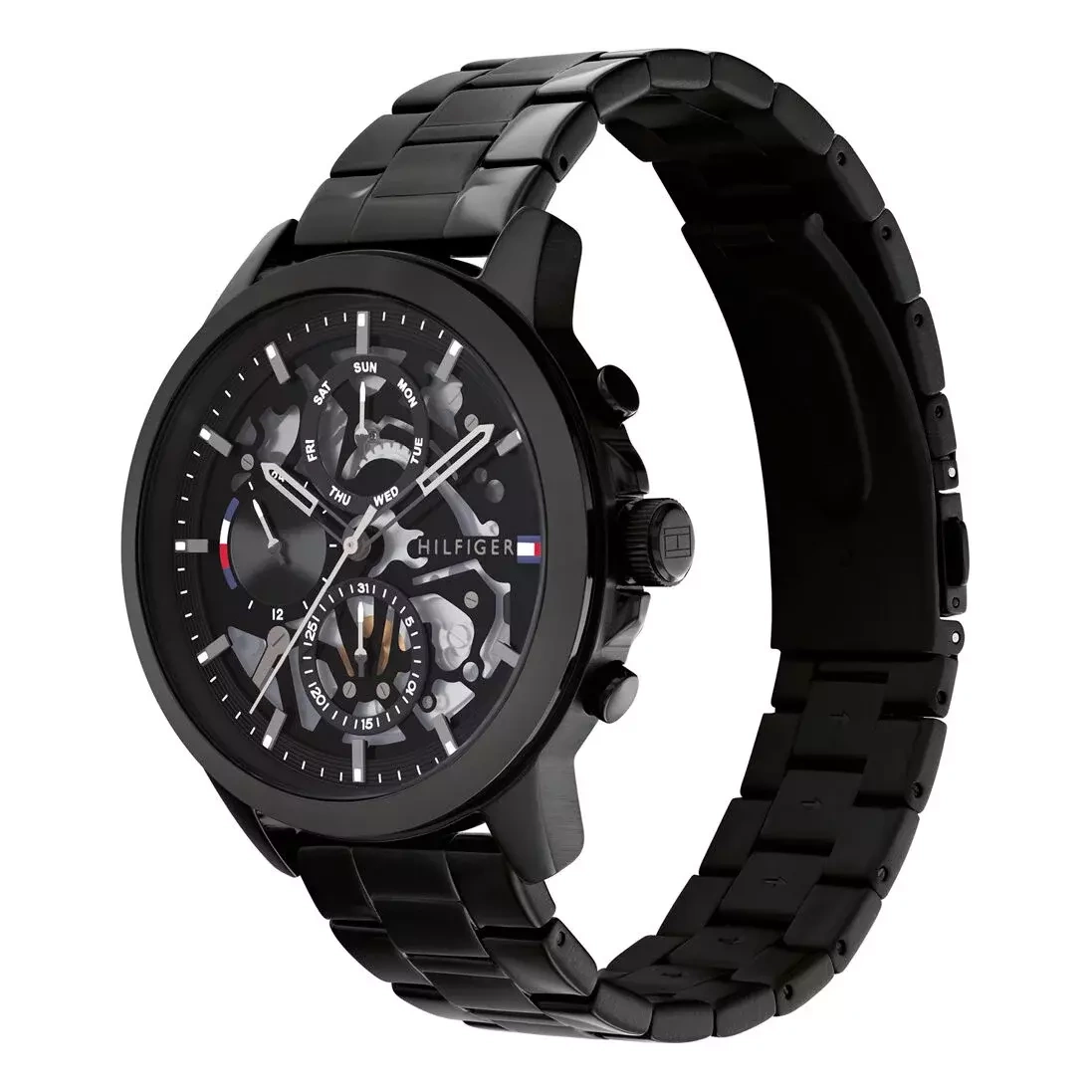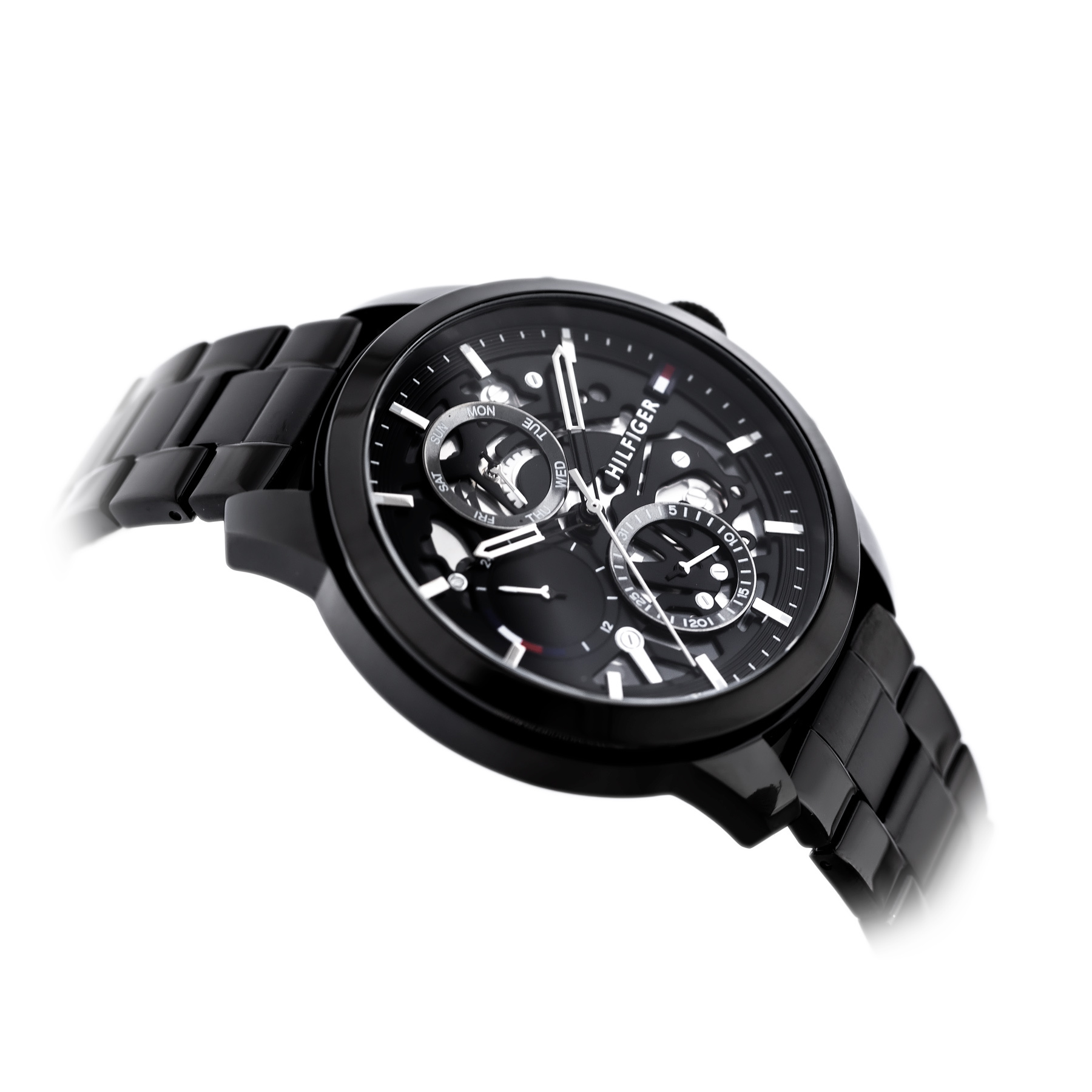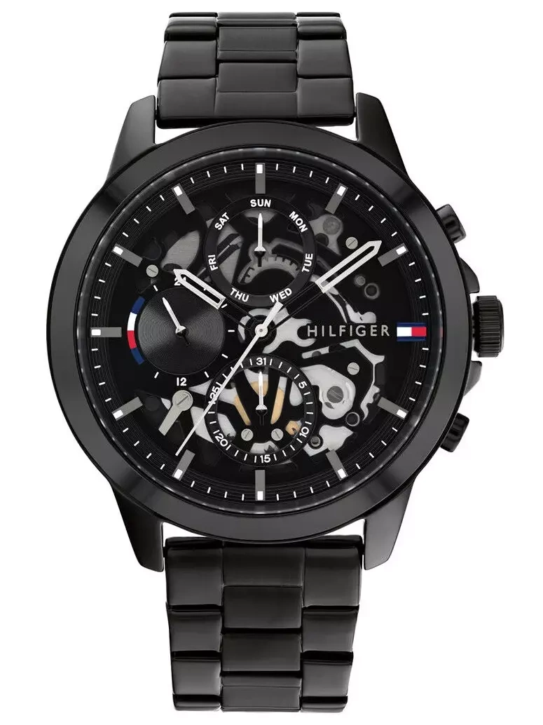 Zegarek męski TOMMY HILFIGER Henry 1710478 to nowoczesny i elegancki model do noszenia na co dzień. Koperta oraz bransoleta wykonana wysokiej klasy stali szlachetnej 316L, odpornej na korozję oraz hipoalergicznej. Na czarnej tarczy, ze szlifem słonecznym, subtarcze wskazujące: dzien miesiąca, dzień tygodnia oraz czas 24 godzinny. Całość chroniona szkłem mineralnym.
