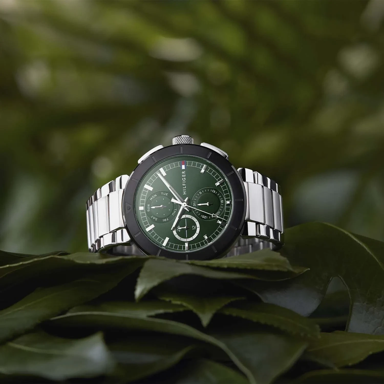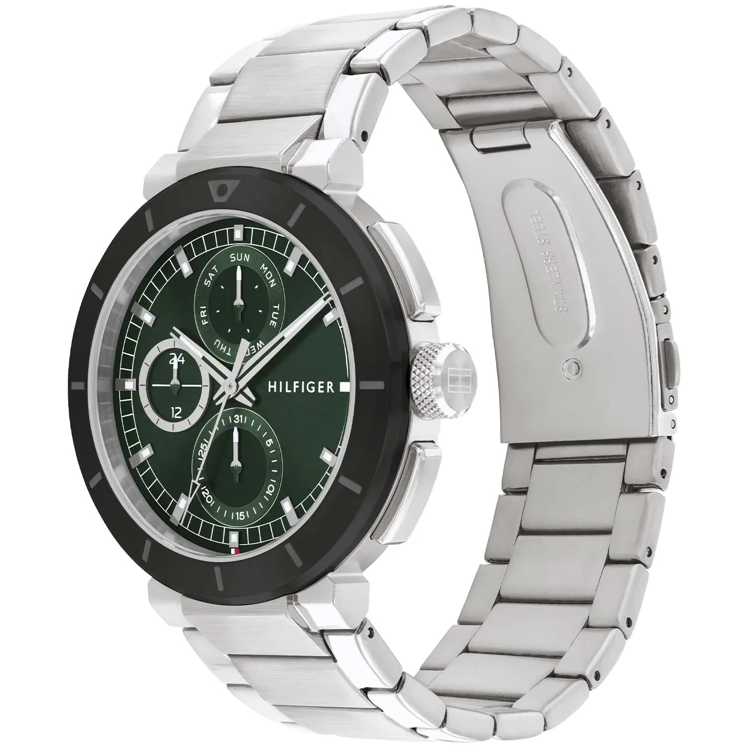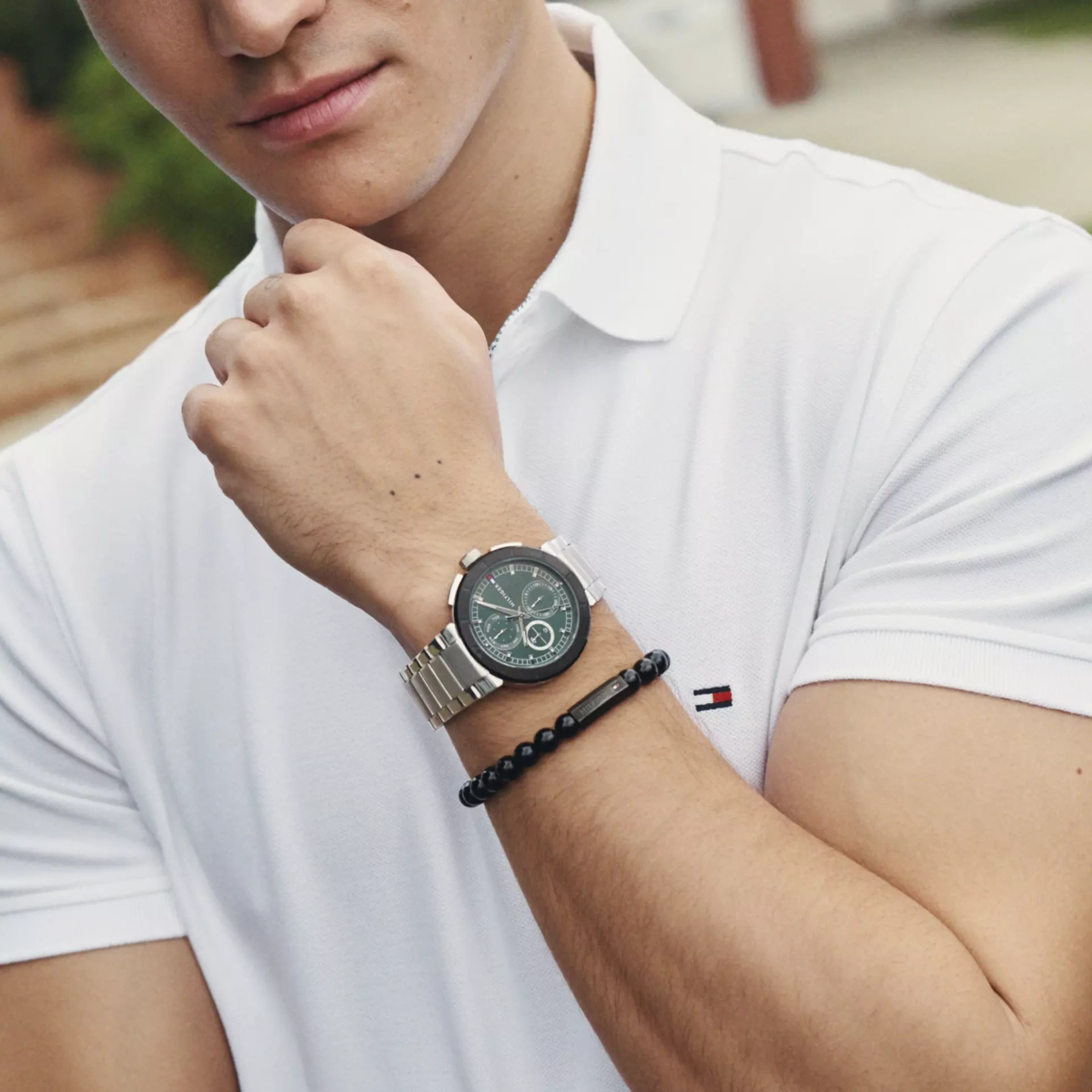 Zegarek męski Tommy Hilfiger Lorenzo 1792117 to modowy model w stylu casual, który pasuje do wielu stylizacji. Koperta oraz bransoleta w swym naturalnym srebrnym odcieniu wykonana z mocnej stali szlachetnej jest odporna na korozję, szkło mineralne na tarczy jest bardzo odporne na stłuczenia i zarysowania. Zielona tarcza została wyposażona w funkcjonalne tarcze czasu 24h, datownika dni tygodnia oraz datownika dni miesiąca. Wodoszczelność zegarka jest na poziomie 5 ATM, można z nim się bezpiecznie kąpać.