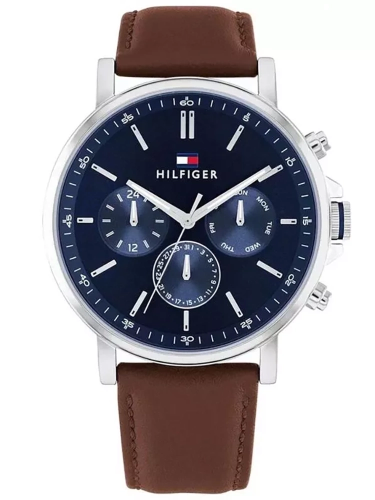 Zegarek męski TOMMY HILFIGER TYSON 1710585 to unikatowe połączenie brązu i srebra. Koperta wykonana z wysokiej klasy stali szlachetnej 316L w kolorze srebrnym, odpornej na korozję oraz hipoalergicznej. Pasek zegarka w kolorze brązowym wykonany został ze skóry naturalnej. Na niebieskiej tarczy, ze szlifem słonecznym, znajdują się subtarcze wskazujące: dzień miesiąca, dzień tygodnia oraz czas 24 godzinny. Całość chroniona szkłem mineralnym. Za odmierzanie czasu w zegarku Tommy Hilfiger 1710585 odpowiada mechanizm kwarcowy, do którego energia go zasilająca pochodzi z baterii. Model 1710585 posiada wodoszczelność na poziomie 5ATM co czyni go w niewielkim stopniu odpornym za wodę. Całość dopracowano w najdrobniejszym szczególe oraz zaprojektowano w zgodzie z aktualnymi trendami w modzie, otrzymując klasyczny, ale jakże elegancki zegarek.