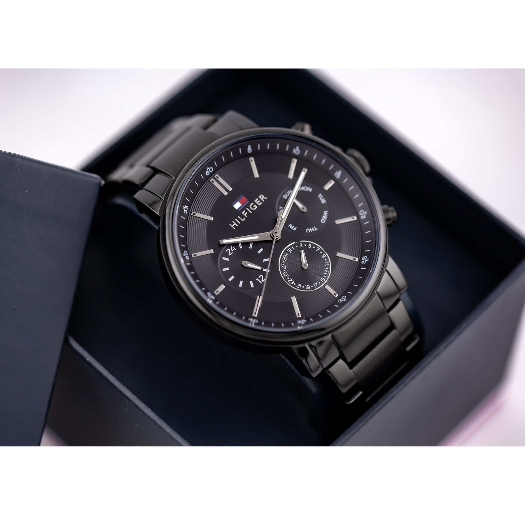Zegarek męski TOMMY HILFIGER TYSON 1710590 to unikatowe połączenie czerni i złota. Koperta oraz bransoleta wykonana z wysokiej klasy stali szlachetnej 316L w kolorze czarnym, odpornej na korozję oraz hipoalergicznej. Na czarnej tarczy, ze szlifem słonecznym, subtarcze wskazujące: dzień miesiąca, dzień tygodnia oraz czas 24 godzinny. Całość chroniona szkłem mineralnym.