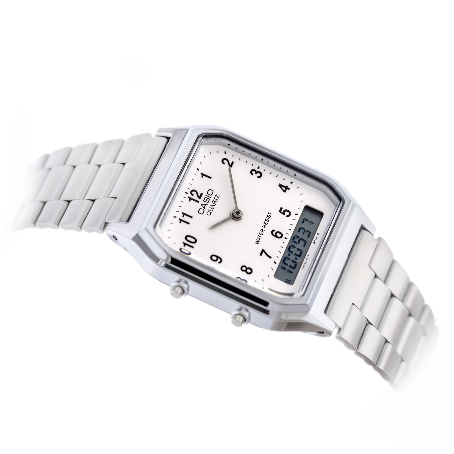 Model AQ-230A-7B oferuje szereg przydatnych funkcji, w tym datownik, stoper, alarm oraz podświetlenie, które ułatwia odczyt czasu w warunkach słabego oświetlenia. Zegarek jest wodoszczelny do 30M (30 ATM), co oznacza, że zniesie zachlapanie wodą, choć nie jest przeznaczony do pływania. Dodatkowo, metalowa bransoleta z zapięciem typu push-button zapewnia komfort noszenia i trwałość.