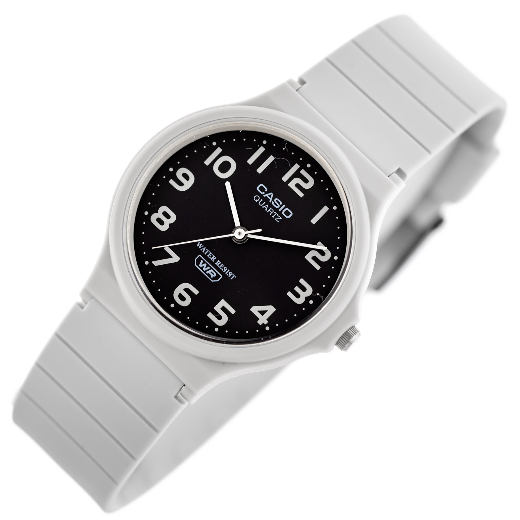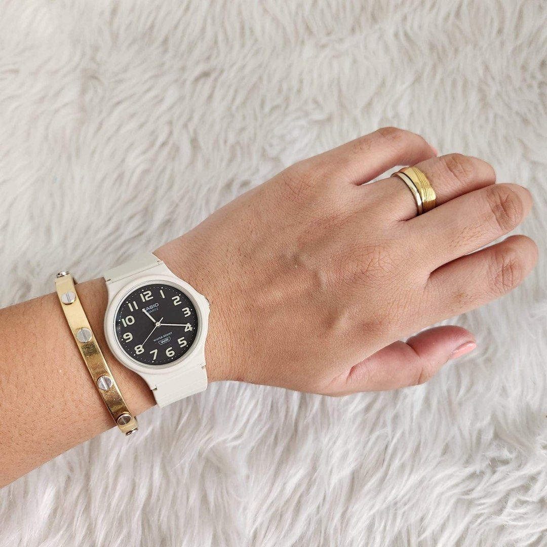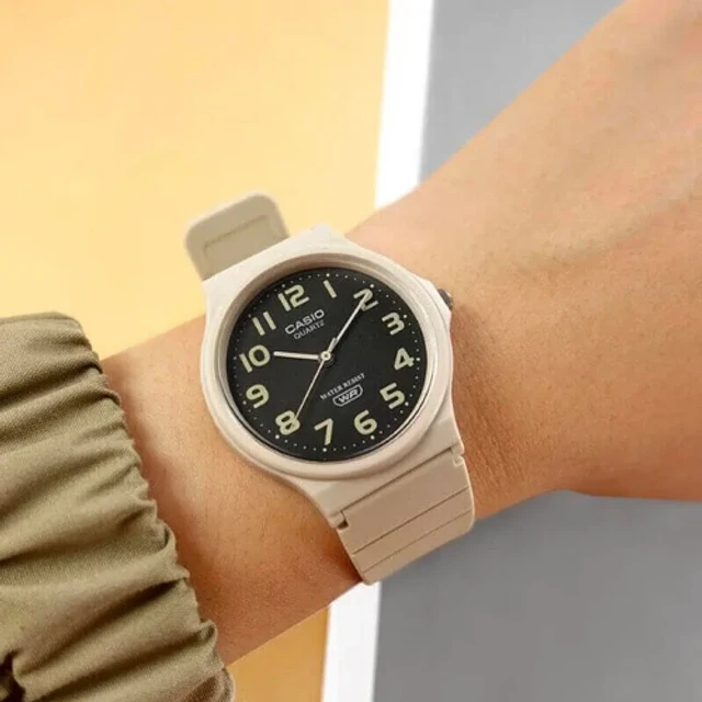 Zegarek damski CASIO MQ-24UC-8BDF to prawdziwe ucieleśnienie prostoty i lekkości. Ten model zachwyca swoją minimalistyczną formą, która doskonale wpisuje się w codzienne stylizacje, dodając im odrobiny sportowego wdzięku. Jego okrągła, wytrzymała koperta z tworzywa sztucznego w beżowym odcieniu prezentuje się niezwykle oryginalnie, a jednocześnie pozostaje uniwersalna, pasując do różnych stylów – od casualowych po bardziej sportowe. Tarcza zegarka, utrzymana w czarnej kolorystyce, została ozdobiona delikatnymi, indeksami w szarym kolorze oraz smukłymi wskazówkami, które zapewniają doskonałą czytelność czasu. Brak zbędnych ozdób sprawia, że zegarek wygląda nie tylko stylowo, ale także niezwykle świeżo i nowocześnie.