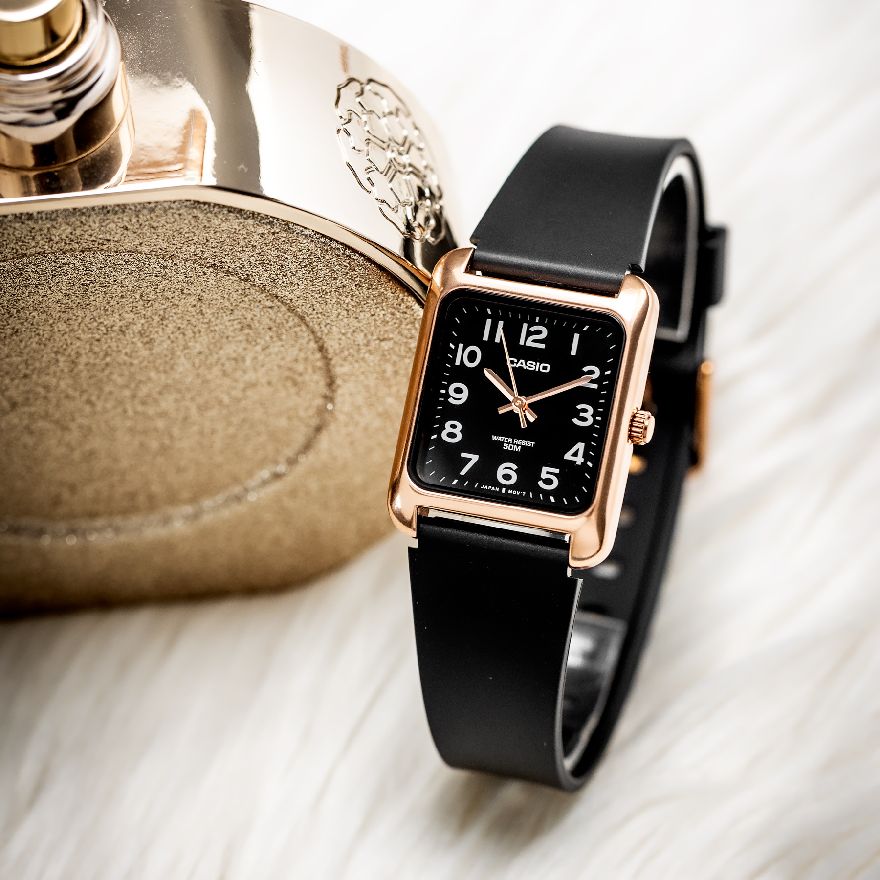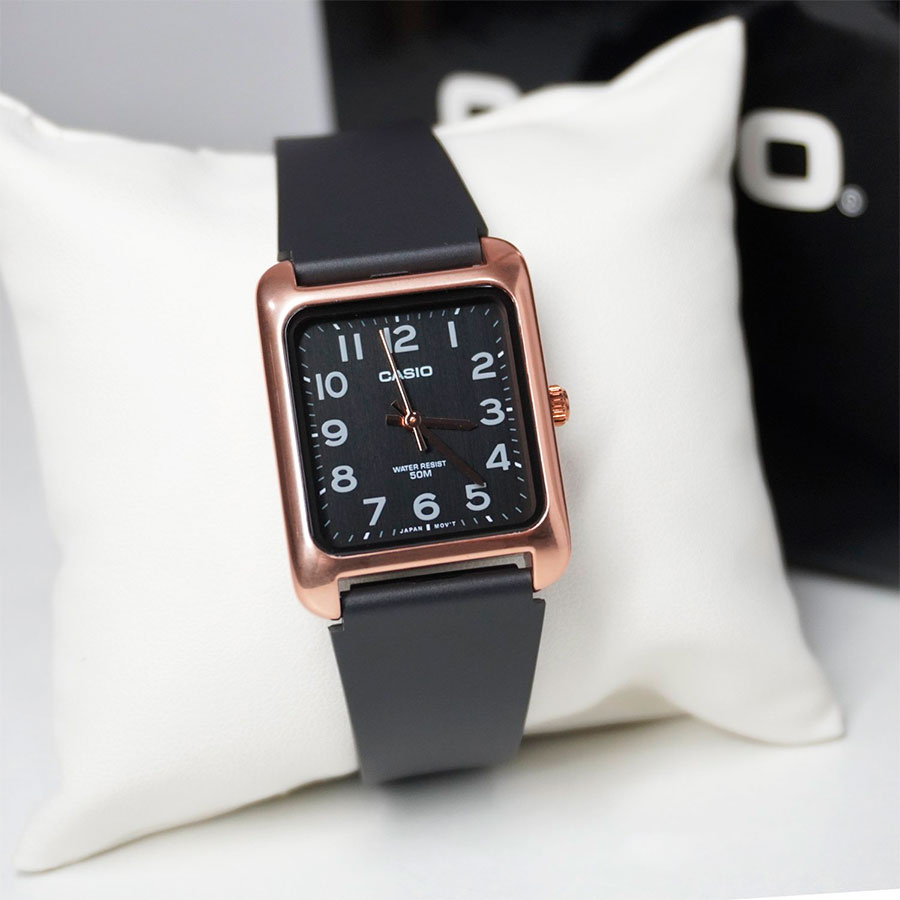 Zegarek unisex CASIO MTP-B175-5B to harmonijne połączenie ponadczasowego designu i praktycznej funkcjonalności, które zachwyci zarówno kobiety, jak i mężczyzn poszukujących eleganckiego dodatku na co dzień. Jego prostokątna, stalowa koperta w odcieniu różowego złota emanuje klasycznym stylem, a jednocześnie prezentuje się niezwykle nowocześnie dzięki subtelnym detalom. Tarcza zegarka, utrzymana w stonowanej, czarnej kolorystyce, została ozdobiona delikatnymi indeksami oraz smukłymi wskazówkami również w kolorze różowego złota, które zapewniają doskonałą czytelność czasu, a jednocześnie idealnie komponują się z kopertą.