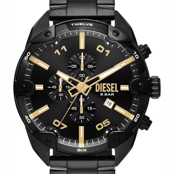 OPIS: Zegarek męski Diesel Spiked Chronograph DZ4644 łączy elegancję z funkcjonalnością dzięki czarno-złotej kolorystyce. Jego koperta oraz bransoleta wykonane są