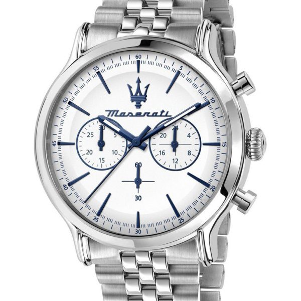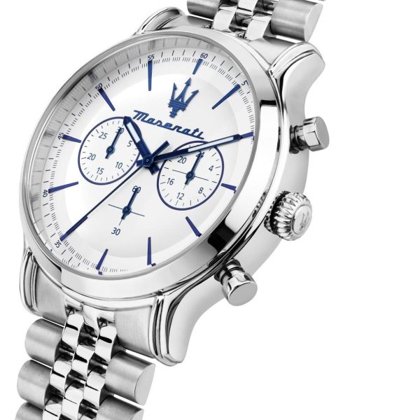 OPIS: Zegarek Maserati R8873618033 EPOCA posiada mechanizm kwarcowy zasilany baterią. Kopertę w kolorze srebrnym wykonano z hipoalergicznej stali szlachetnej. Na