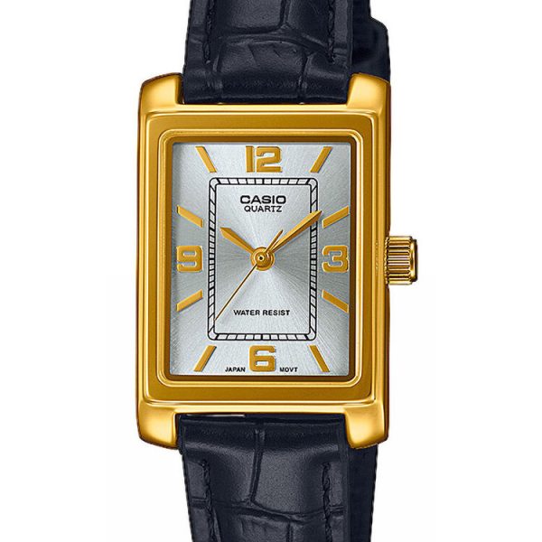 OPIS: Zegarek CASIO LTP-1234PGL 7A2EF wyróżnia się elegancją prostokątnej koperty i minimalistycznym designem. Jego niezawodność oparta jest na precyzyjnym japońskim