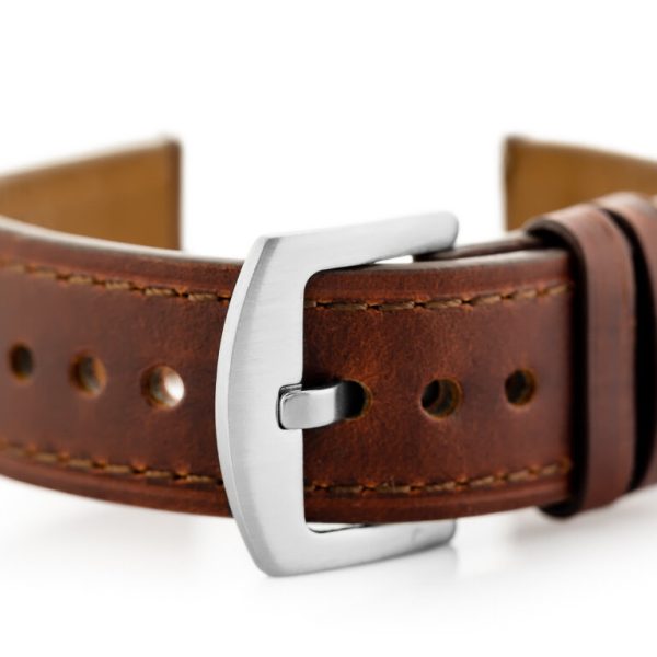 OPIS: Pasek ze skóry naturalnej w kolorze ciemnobrązowym przeszywany brązową nicią. Klamerka metalowa w kolorze srebrnym. WYMIARY szerokość przy mocowaniu: