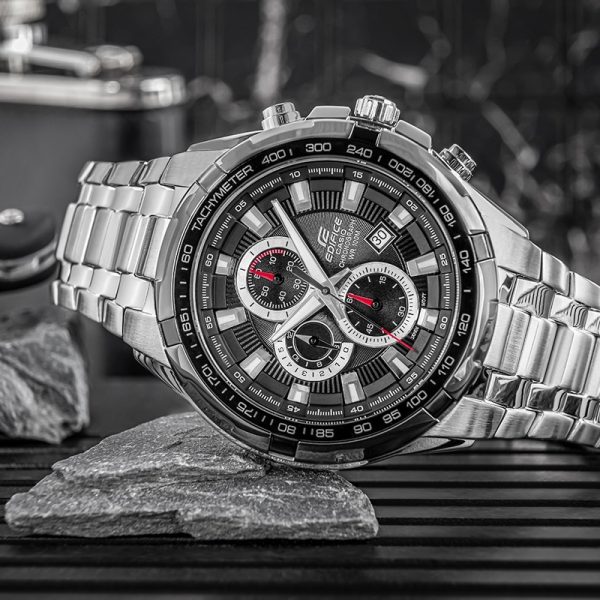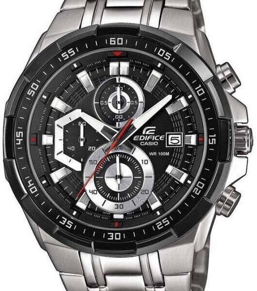 OPIS: Casio Edifice EF-539D-1A to męski zegarek o wyrazistym, sportowym charakterze, inspirowany stylistyką motoryzacyjną. Dynamiczna tarcza z rozbudowanym chronografem oraz